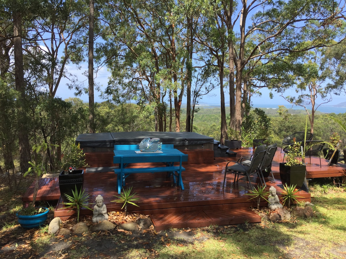 Unwind in your private self contained, studio style cabin nestled on 25 acres of peaceful, natural bushland overlooking the pristine northern shores of Port Stephens. This one of two cabins on our property. From your deck, enjoy the sweeping panoramic views of this blue water wonderland. Soak in our large,communal, heated swim/spa while enjoying the view. An ideal romantic retreat for couples wanting a weekend escape.