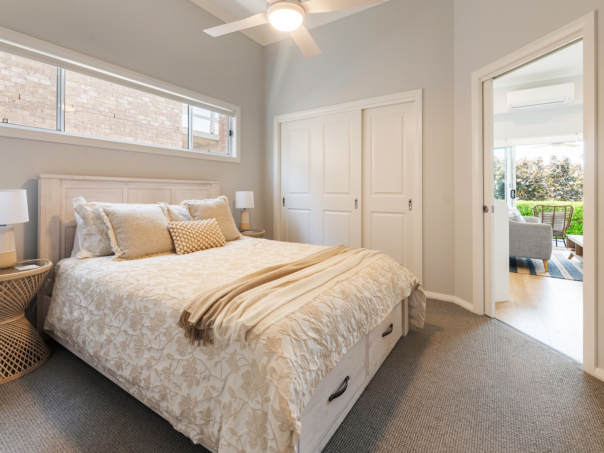 Lux very private apartment, great location conveniently between Nelson Bay Town Centre Marina and Salamander Shopping Square with a short walk to Bagnalls and Dutchmans beaches. The balcony overlooks the beautiful Nelson Bay Water, great sunsets and views to the Whispering Bridge at Hawks Nest. Access through a private entry off your own garden giving seclusion and privacy. All new contemporary designed with a spacious bedroom, bathroom and well equipped kitchen, smart TV. and free Wi-Fi.