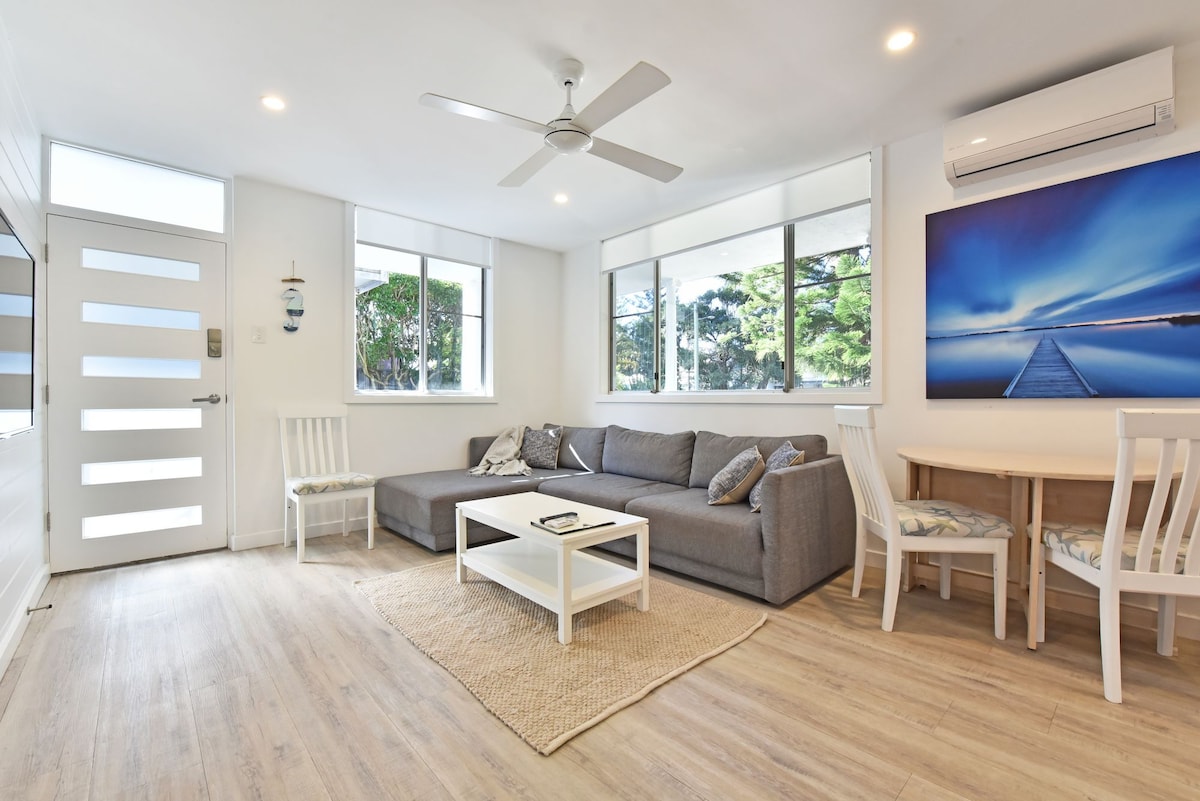 Escape to the turquoise waters and white sands of Hawks Nest. Stay and relax in our beautiful two-bedroom modern coastal apartment opposite Jimmy's Beach. This property has been completely transformed through a full renovation in December 2022. Follow us to see more photos! @winneys.place Fully equipped kitchen with dishwasher, full luxury linen (sheets, bath & beach towels) provided as part of your booking.