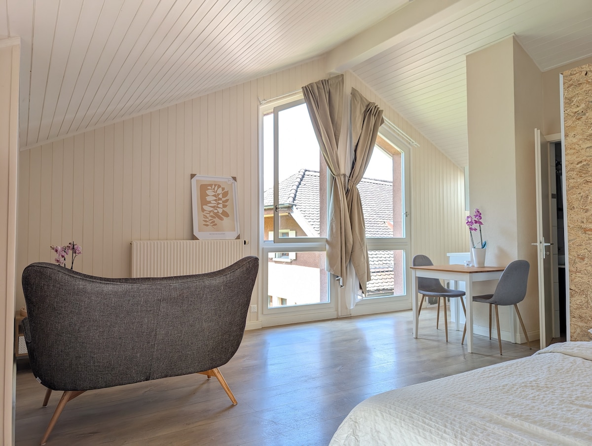 Loft au pieds du Lac Léman. 2 vélos mis à disposition pour profiter des alentours. Parking privé gratuit 🅿️ Frais nettoyage offerts Appartement de 66m2 avec aménagement intérieur moderne et cosy. - Grand lit king size 180 x 200 - Salle de bain avec baignoire. - Lave linge et sèche linge. - Cuisine ouverte sur le séjour. - Salon avec canapé transformable. - TV 65’ - Wifi Grand balcon avec vue dégagée sur le port de la Marina et des montagnes. - Place de parc privé dans un parking extérieur.