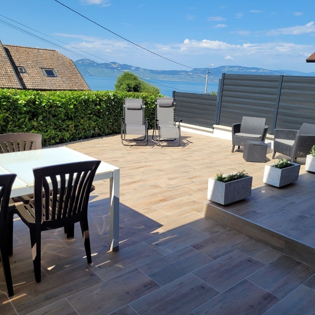 Hello, It rarely snows here, but we are only 15 minutes from the Thollon-les-Mémises and Bernex ski resorts, and 1 hour from the Portes du Soleil (Morzine). We rent a 45 m² apartment on the ground floor of our house with a lake view. It is fully independent, with parking and access to a double-fenced garden. A baby cot and high chair are available on request. Feel free to contact me.