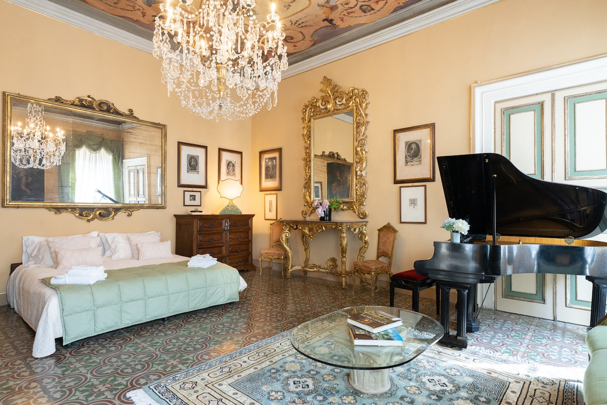 Situated on the first floor of Palazzo Pfanner, a charming baroque Palazzo and building of historical interest in the centre of the town of Lucca, the apartment recreates perfectly the atmosphere of the antique noble residences for visitors who wish to try this unique experience. The apartment, which has frescoes dating back to the 18th and 19th centuries and the original ceiling with beams and ‘seminato alla veneziana’ flooring, offers a splendid panoramic view over the garden.