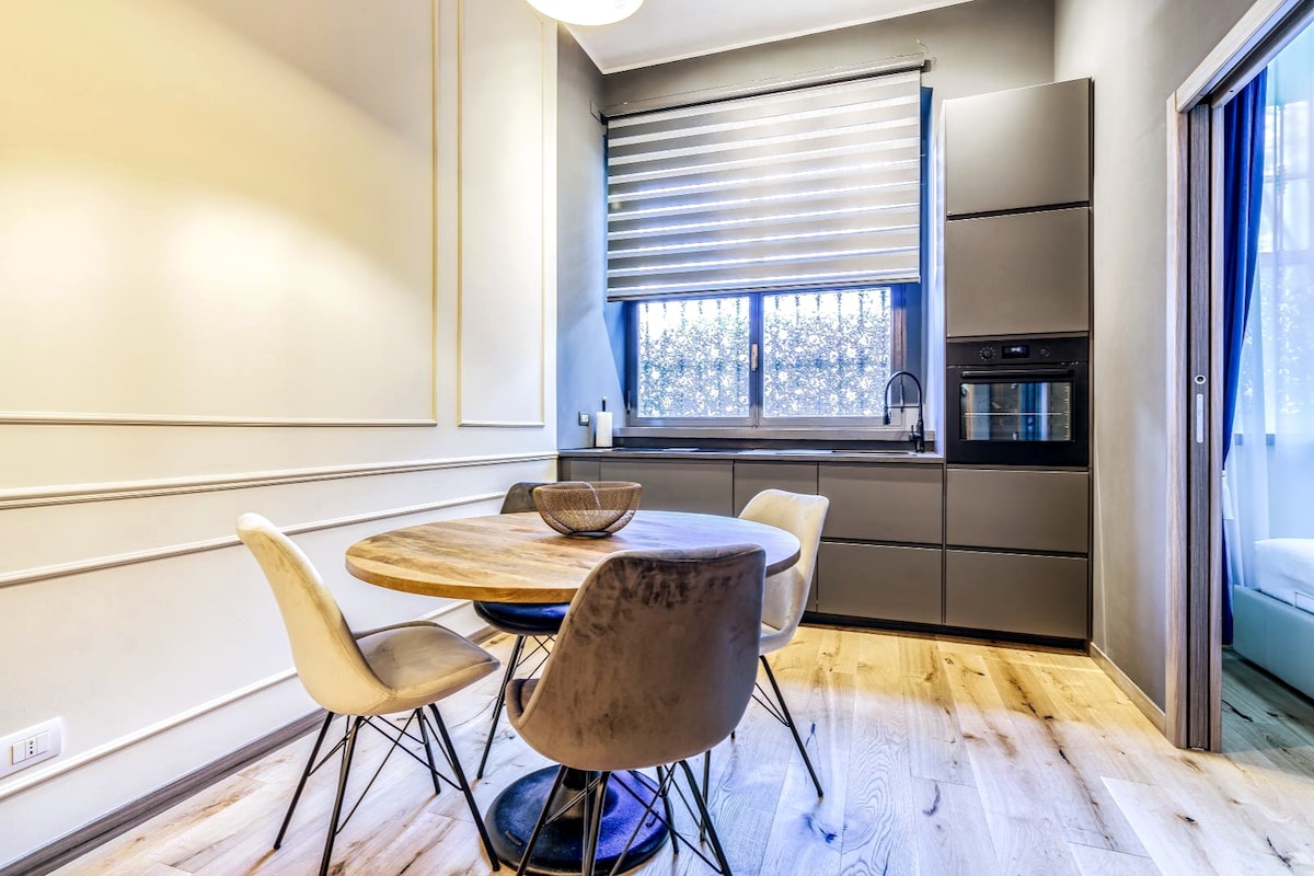 This comfortable apartment offers 67 sqm of space. Ideal for up to five people, its two double beds (160x200), sofa bed (90x200) and two modern bathrooms with shower make this stay a perfect way to experience Milan. The room also offers a kitchen and a dining table, so you’ll have everything you need for maximum comfort and minimal stress.