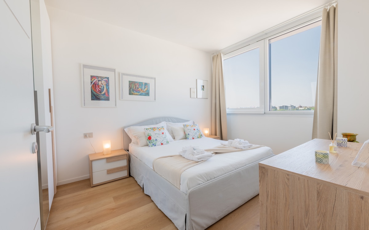 The apartment consists of 2 double bedrooms, a bedroom with 2 single beds, Living Room with Smart Tv and sofa bed for two guests. Kitchen equipped with microwave, refrigerator, induction plate, Nespresso machine, kettle, washing machine, washer-dryer. Bathroom with shower. Wi-Fi and Air Conditioning.