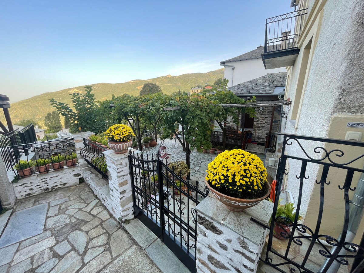 The accommodation is a new traditional two floor mansion in the wonderful village of Makrinitsa on the blessed mountain Pelion with astonishing view to Pagasitikos gulf, surrounding mountains and the city of Volos. Easily accessible only 20 minutes driving from Volos city and 3 minutes walking from the parking place. Sunny and cozy can guest up to nine people. It is 3 minutes walking from the beautiful center of Makrinitsa with lovely restaurants and cafe's, and 30 minutes from Hania ski resort.