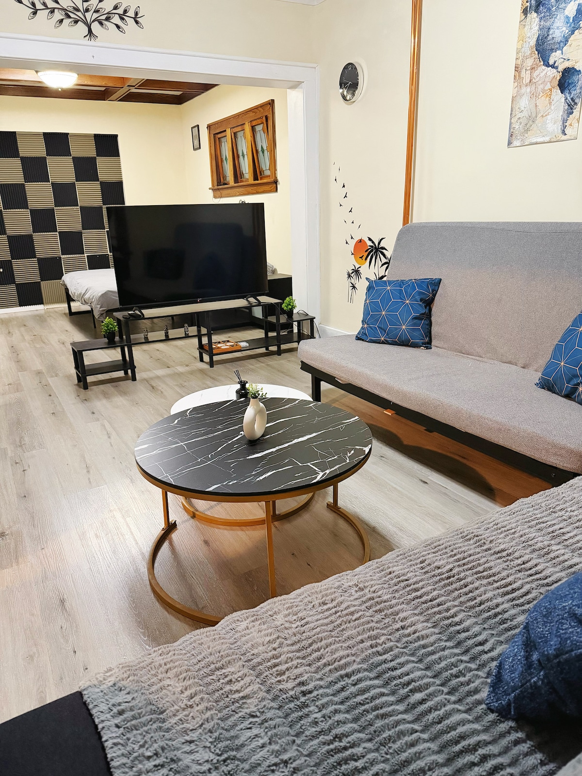 Cozy one bedroom apartment in a quiet neighborhood, about a 5 to 10 minute drive or 30 minute walk from Niagara Falls and Clifton Hill. Relax in the living room with 55 inch smart TV and Netflix, enjoy 1.5 Gbps fiber Wi Fi, and cook homemade meals in the basic functional kitchen. Comfy king bed, fresh linens, self check in with smart lock, pet friendly and free onsite parking make it a calm, practical base for couples, friends and work trips who prefer a clean home feel over a busy hotel.