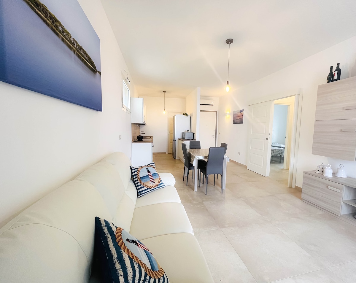 Appartamento di 40 mq circa; ha una comoda camera matrimoniale ed un ampio soggiorno. Ideale per coppie oppure famiglie con bambini piccoli che potranno usare l'antistante corte interna della struttura dotata di divanetti e comode sedute. L'appartamento dispone di cucina e soggiorno con tv con un comodo angolo living con un divano che può ospitare due comodi posti letto singoli. L’appartamento è situato al piano terra della nostra struttura ed è dotato di biancheria da letto e da bagno.