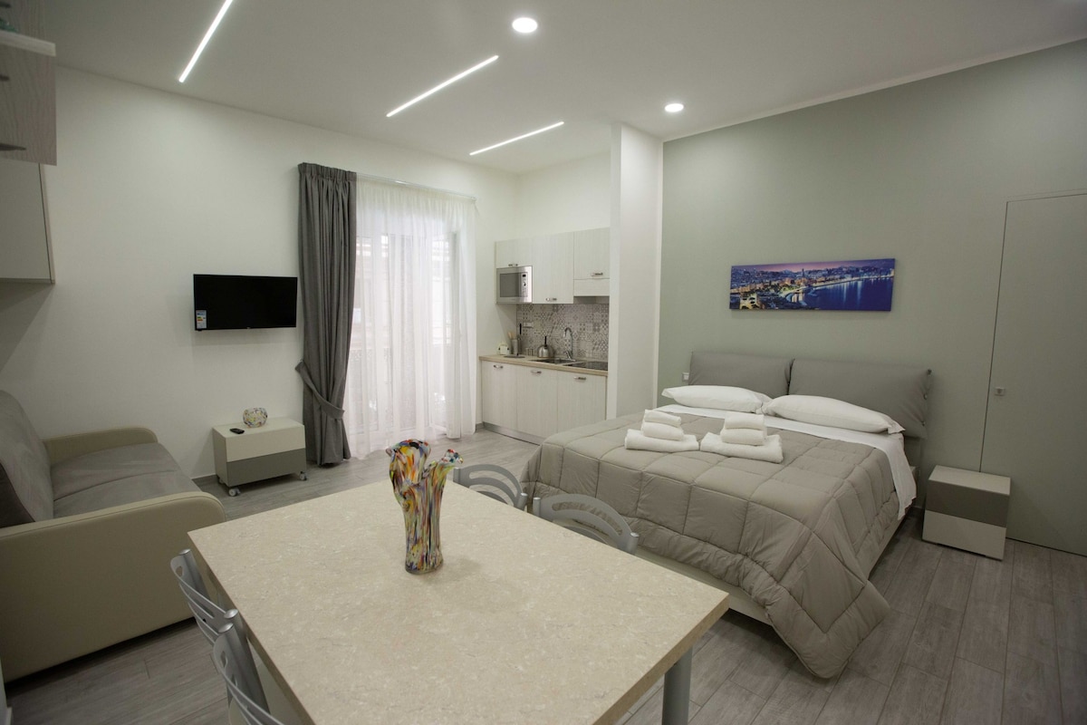 Exquisitely renovated apartment in an 18th century building, located in the beating heart of the city, near the Royal Palace, just a few minutes from the "lungomare" and the harbor, where ferries depart for the islands of Capri, Ischia and Procida and the Amalfi Coast. The space is compact, but very well equipped. There is plenty of artificial light along a full-lenght window door opened out to a common balcony around a typical Neapolitan courtyard.