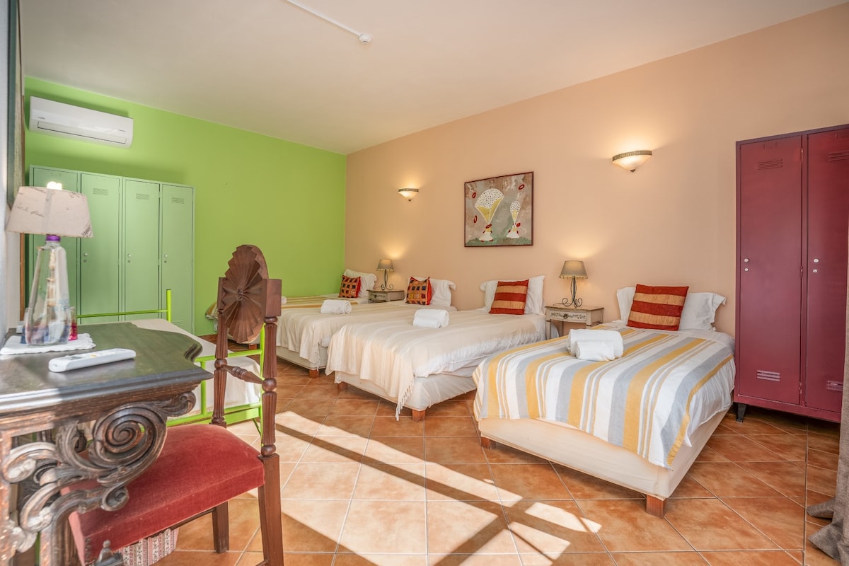 Quarto muito espaçoso, para 4 pessoas, ( a pedido, se possivel, custo extra, 5p), com w.c privada com banheira, 2 janelas, com vista para o pátio . Tem A/C, armários, que a pedido podem ter chave, fervedor electrico e água de oferta. Pode ser reservado com tipologia de 5 camas individuais, ou 3 individuais e 1 cama de casal. Com especial pequeno- almoço, com frutas e legumes de produção orgânica, e a pedido, no check-in, a custo extra, opção: vegetariana/ vegan/ sem gluten / sem lactose.