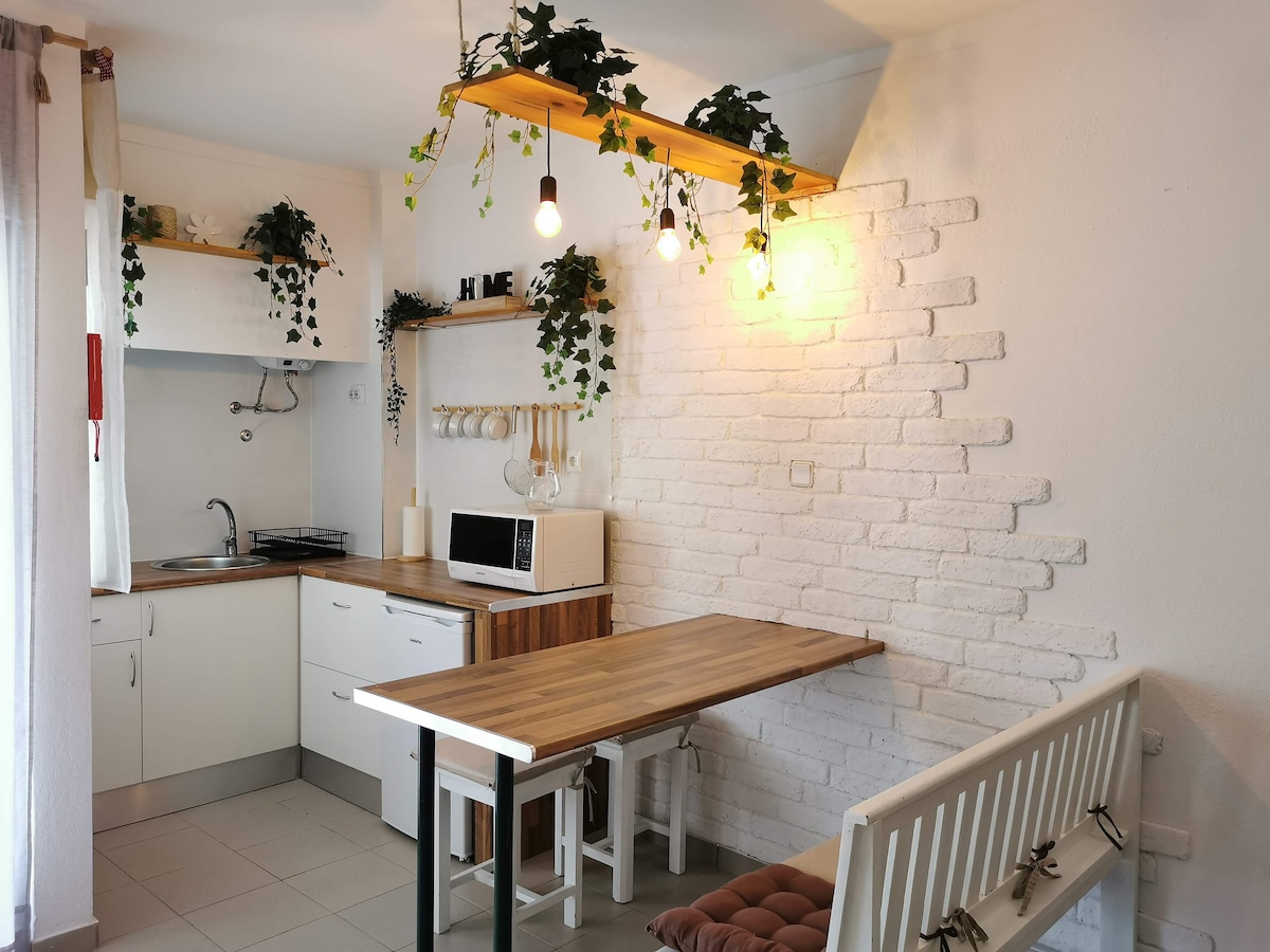 Estúdio privado e independente com entrada própria e estacionamento gratuito disponível na rua Dispõe de ar condicionado, lareira, TV por cabo, wi-fi, cozinha com todo o equipamento necessário, WC com chuveiro e pátio exterior privado Ideal para casal e uma criança, tem uma cama de casal e cama extra dobrável de 1.80 x 0.80 cm Fica localizado na periferia da cidade em zona residencial calma e segura a 10 min de carro das praias e a 5 min de carro dos centros comerciais e restaurantes