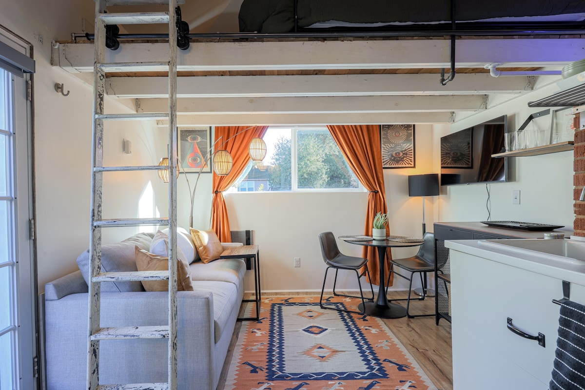 Escape to a cozy garden oasis with a hot tub in this cozy guesthouse, perfect for two. Enjoy a private entrance, free parking, and a loft bed accessible by ladder, plus a pull-out sofa. Relax with blackout curtains, streaming platforms, and a guest patio. Conveniently located just 15 minutes from the airport, near the MAX line, bus stops, and the interstate. A short drive to downtown, the Convention Center, MODA Center, and Alberta Arts, with top restaurants and attractions nearby.