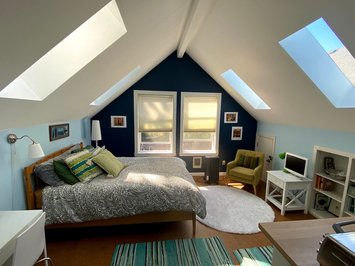Explore the world-class restaurants, coffee shops and bars in the nearby Williams and Mississippi districts. Take a stroll around the award winning (and oldest) rose garden in the City of Roses across the street in Peninsula Park. At home, this second story studio has extra space in the meditation loft, a full kitchen, fast internet, and projector for streaming. Enjoy your private deck over the shared garden with hammock and H/C outdoor shower. Bus and train nearby with ample on-street parking.