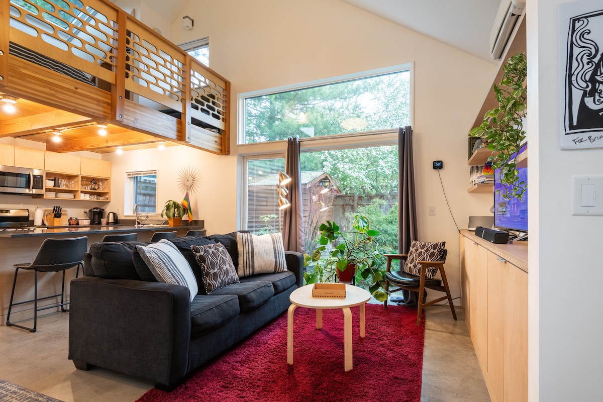 Welcome to Juniper House! We designed our backyard guesthouse to be a bright, cozy loft, full of sunlight, exposed wood, tasteful furnishings and colorful finishes. Enjoy a private, 600-sq-ft space with an outdoor patio in a quiet, close-in Portland neighborhood, just blocks from light rail and within walking distance to a wide variety of great restaurants and watering holes. Perfect for couples and longer stays.