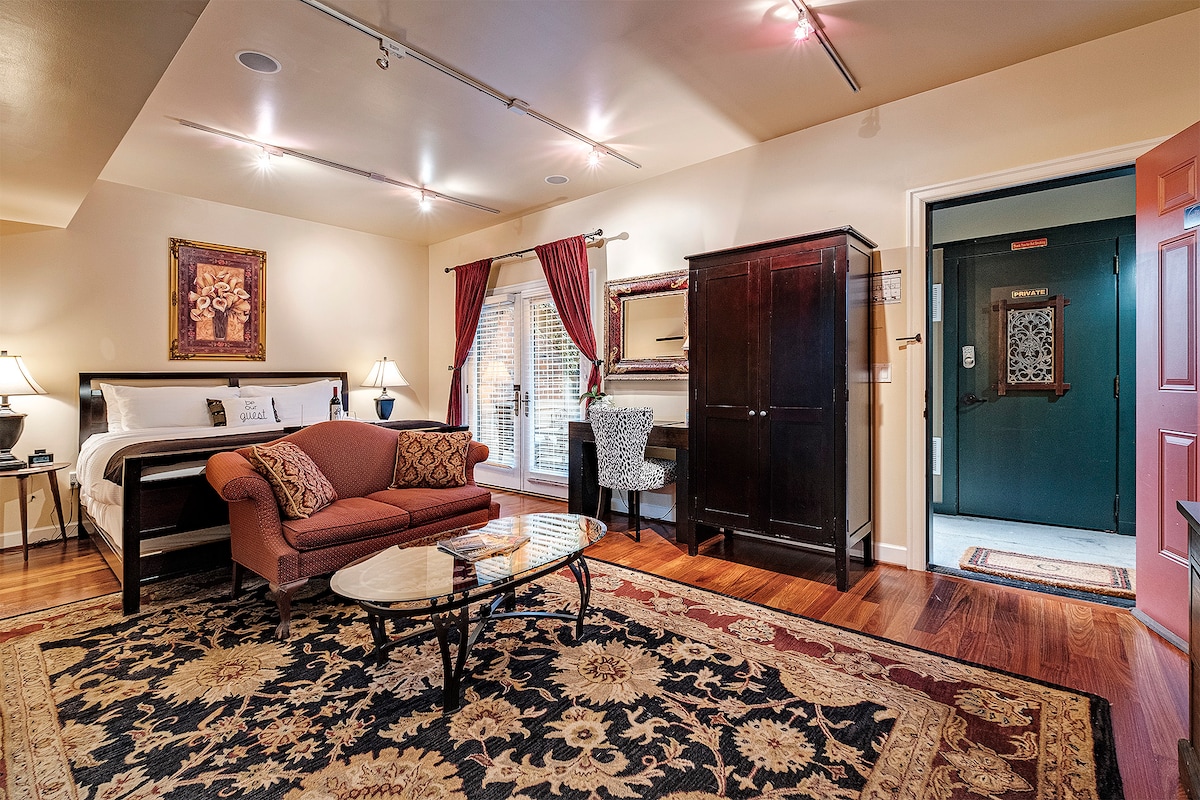 Soothing, plush and quiet; a California King Bed awaits, with high thread-count sheets, crisp white duvets and your choice pillows. Please be aware these rooms are shower only. Windows or French Doors open to a private courtyard with relaxing seating, dense lush landscaping and some with the sound of a tranquil fountain. Each suite has a personal refrigerator, a working area and a cozy place to kick back and watch TV. Kitchenette amenities upon request.