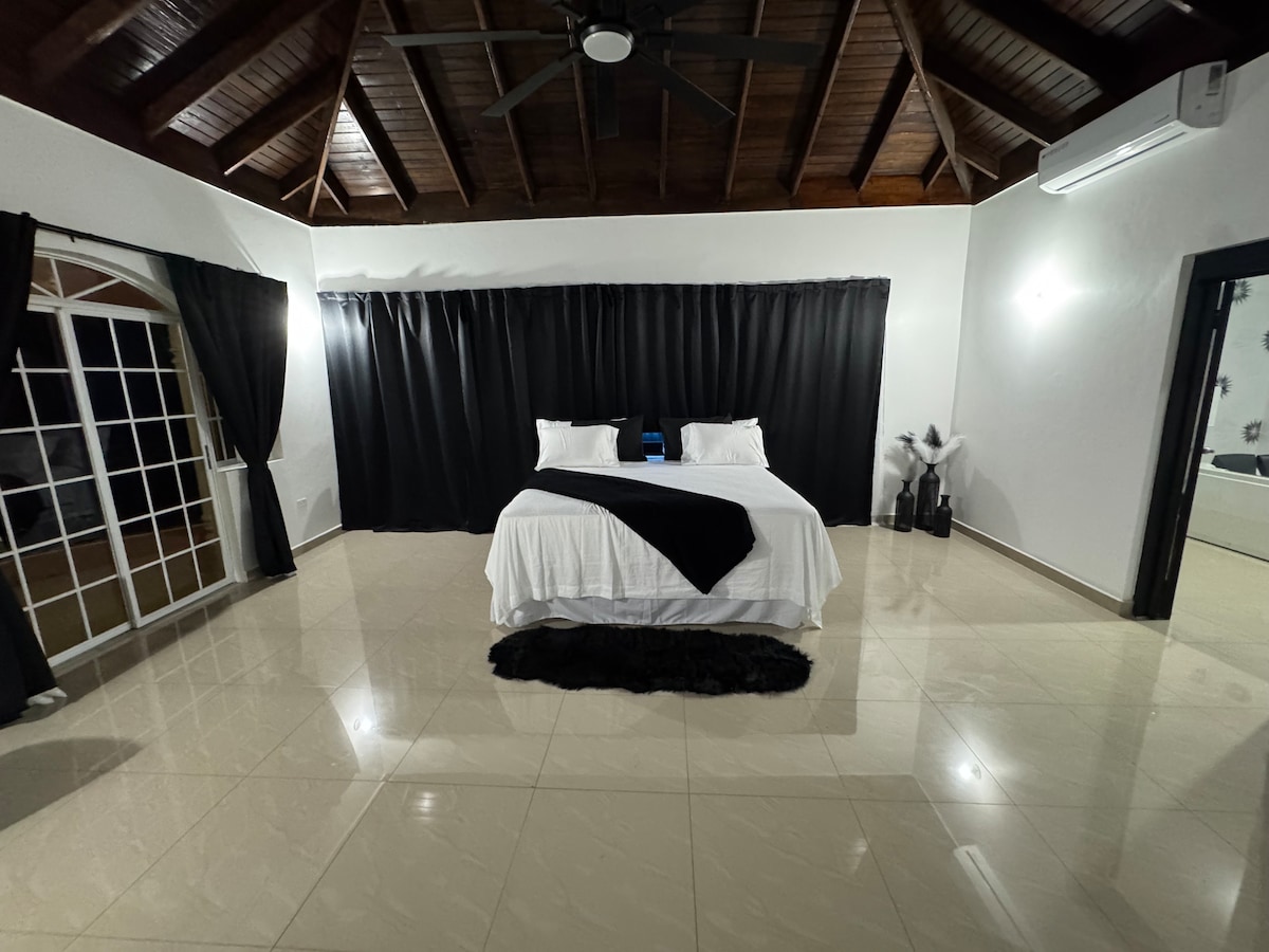 Immerse in luxury in our 2-bedroom, 2-bath upstairs apartment in Caribbean Estate. It features a spacious Mega master bedroom, a 70-inch TV, a relaxing jacuzzi, and a large balcony. Complete with a work desk, chair, and cozy couch, this tranquil, gated community blends comfort with elegance, ideal for both relaxation and work.