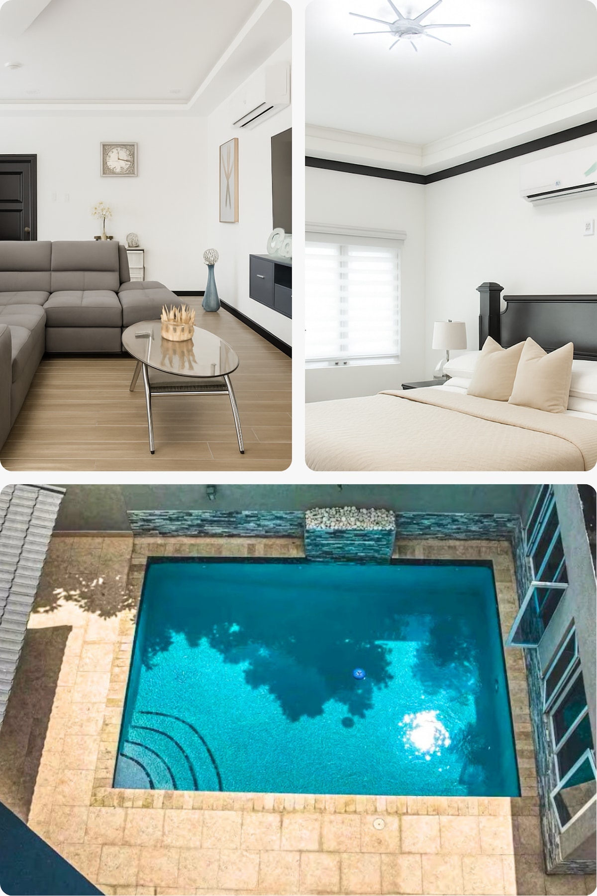 Luxury condominium in the heart of Kingston. Centrally located and five minutes away from the Half Way Tree and New Kingston commercial hubs. The apartment is in a gated complex with 24 hour security. There is WiFi, and a balcony overlooking the pool, street view, available parking and AC throughout. Access to the washer and dryer is available ONLY to guests staying a minimum of 7 nights.