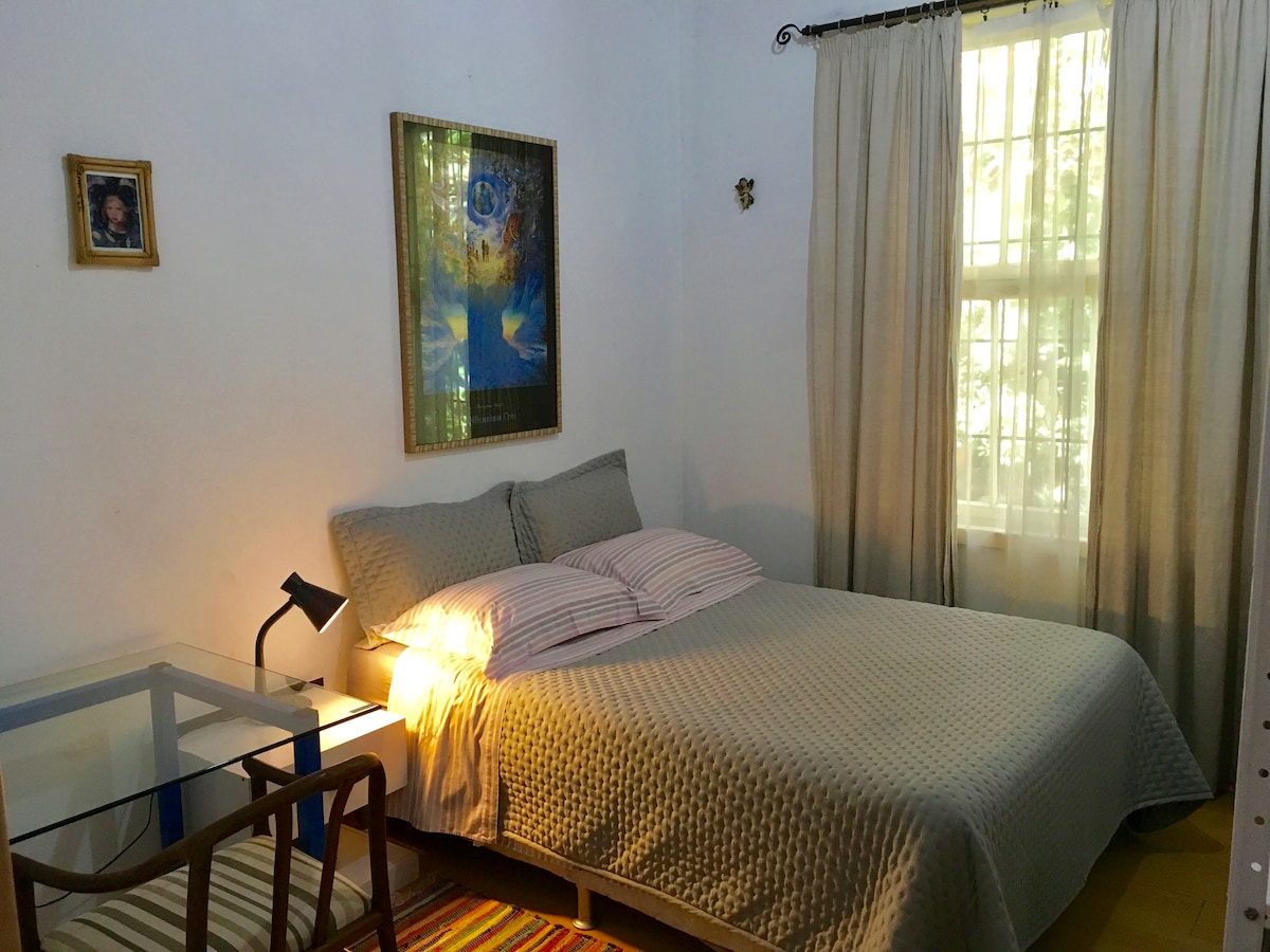 Casa bem iluminada, em lugar alto, seco, e arborizado. À noite é bastante silenciosa, propícia ao descanso. A casa é pouco movimentada, normalmente circulam dois moradores adultos. O hóspede tem livre acesso nos horários que precisar.