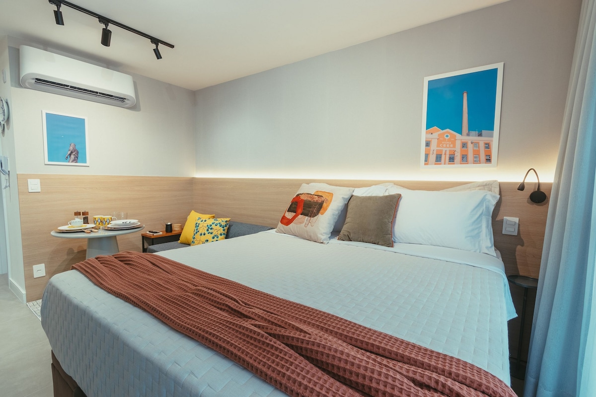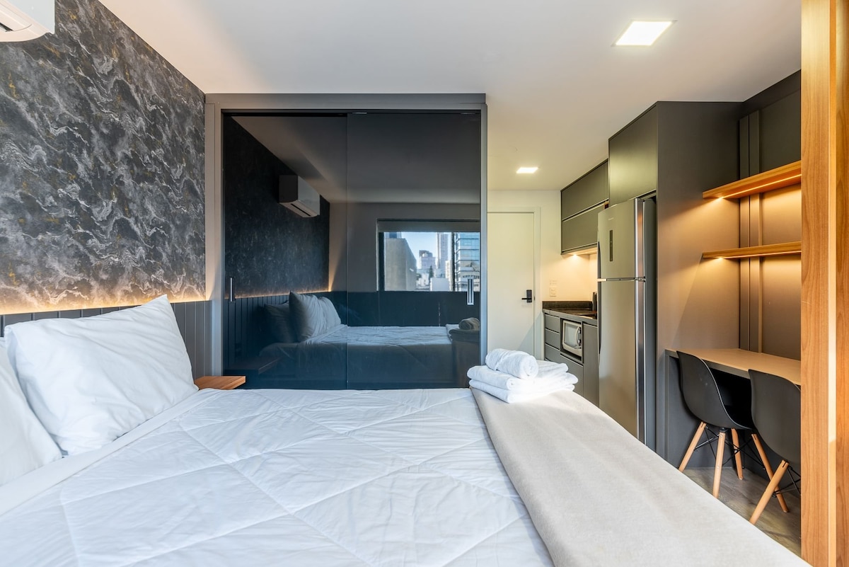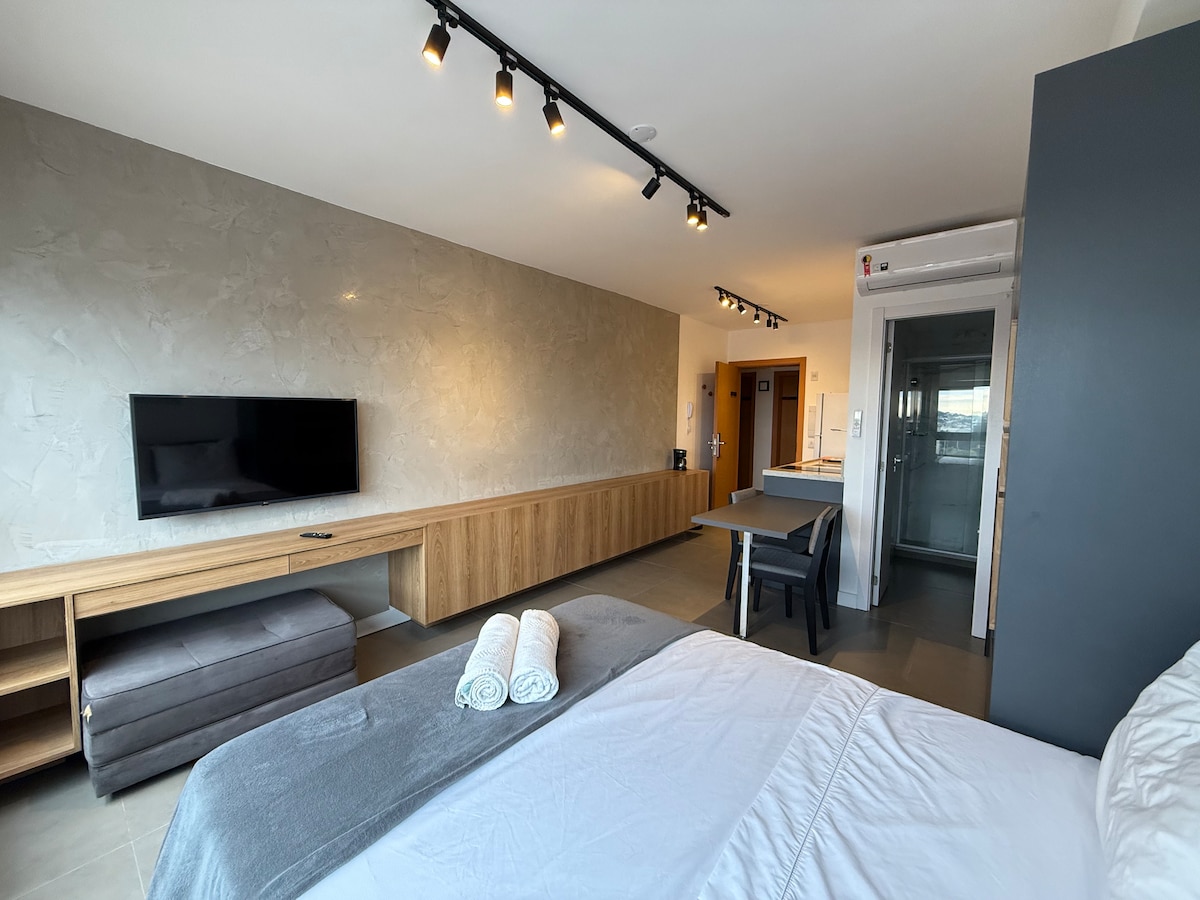 Estúdio moderno e acolhedor, decorado por arquiteta, em andar alto, com ampla vista da cidade, em região segura e tranquila. Ideal para trabalho ou lazer, possui Wi-Fi rápido, Smart TV, cama queen com black-out, sofá-cama, ar-condicionado, armários e cozinha funcional com frigobar duplex. Banheiro com toalheiro térmico, chuveiro potente e secador. Prédio com academia 24h, piscina térmica, rooftop e lavanderia. A 850 m do Parcão.
