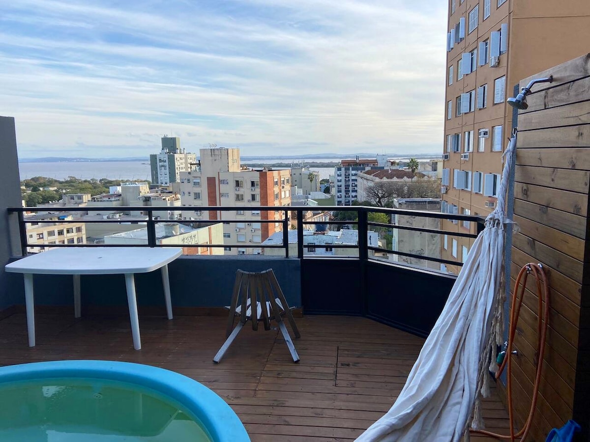 Duplex com sacada com jacuzzi e vista para o Guaíba! ☞ Jacuzzi 3 pessoas ☞ Terraço ☞ 1 Suite c/ banheiro ☞ 300 Mbps wifi ✭“Com certeza voltaria!” ☞ 3 Smart TVs c/ Netflix e canais abertos (maior é 55 polegadas) ☞ Churrasqueira (carvão) ☞ Cozinha totalmente equipada ☞ Self check-in ☞ Air condicionado ☞ Café Coado 》25 mins para aeroporto 》5 mins até Orla do Gasômetro