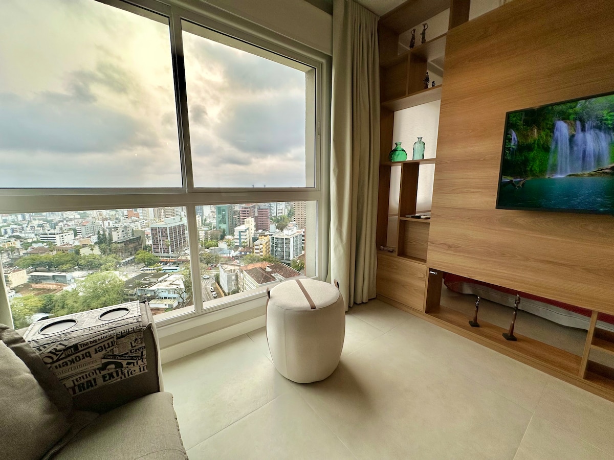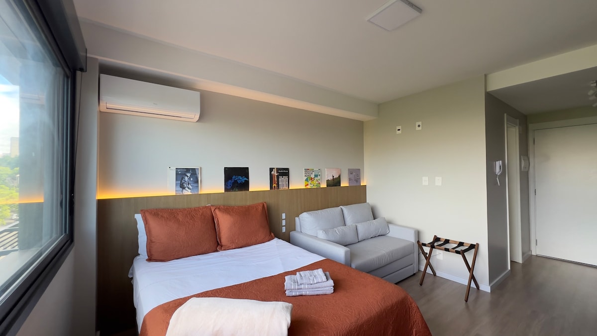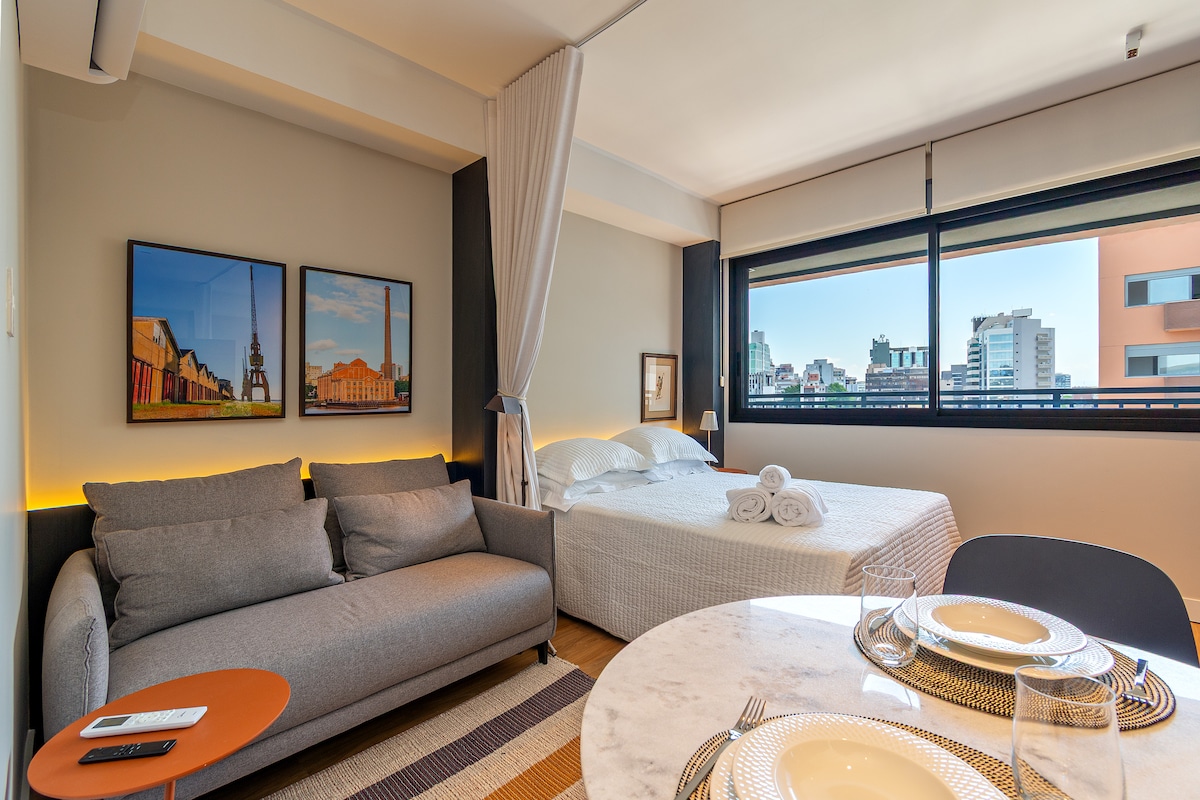 Brand new studio 43sqm in TREND CITY, amazing panoramic view (16th floor) to Guaíba Lake, Lake Shore and Marinha Park, condominium with complete infrastructure, concierge 24h, parking space, gym, 20m heated pool. Queen size beds, space to work with laptop, hot and cold air-conditioning 24,000, Smart TV 50, cable TV NET HD with 250 channels, Wi-Fi 250 mbps, barbecue pit, wash and dryer machine, iron, hair dryer, microwave, airfryer, tag and electronic lock.