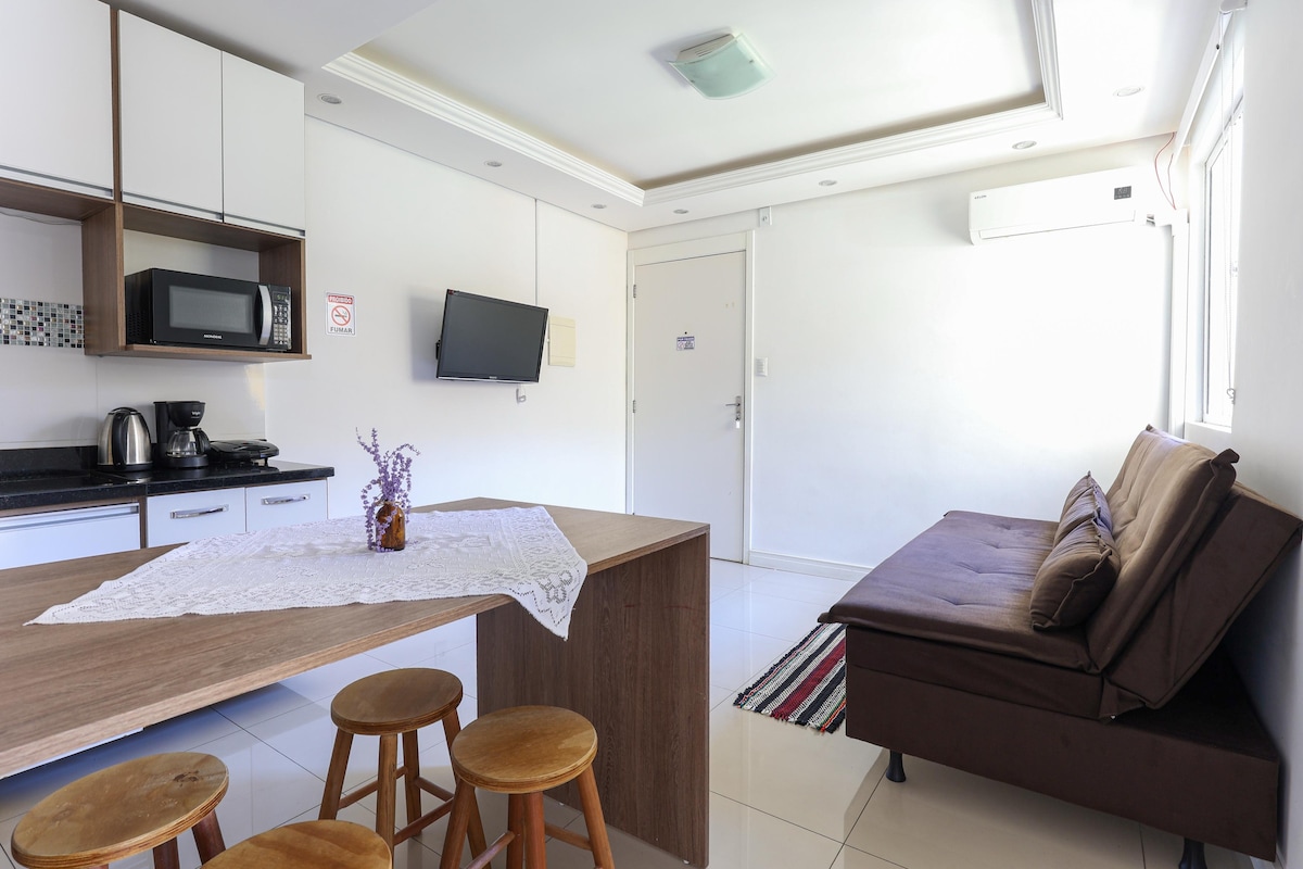 Silent building and the space is a division of mine, with exclusive entrance and total privacy (see photo). Cable TV, wifi internet, and appliances for preparing simple meals. It has bed and bath linen and covers. The Cidade Baixa neighborhood is close to important points of the city, with ease of public transportation to venues and major events. Great for UFRGS students - it's near the Centro Campus and for the Campus do Vale or PUC, the bus is a block away.