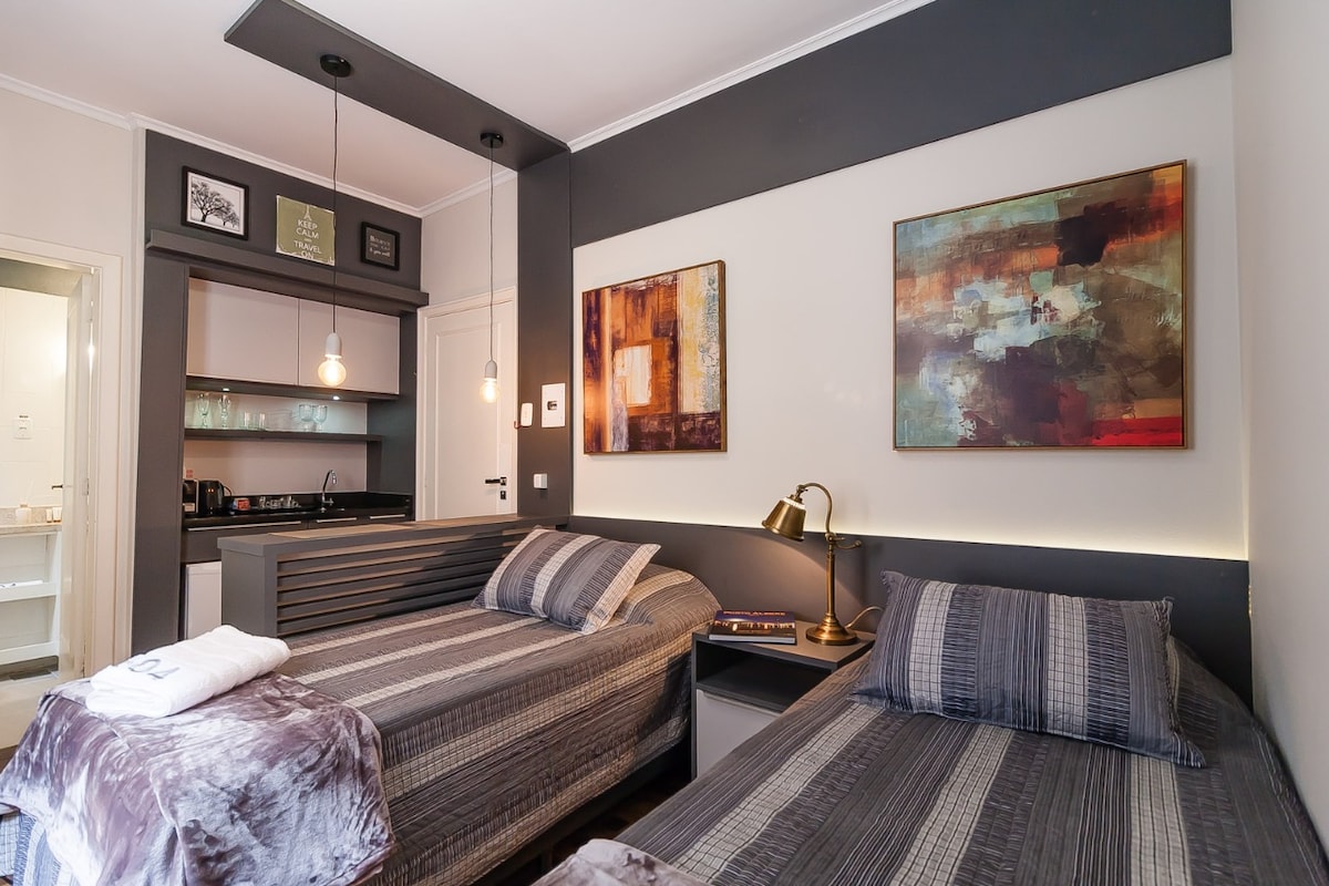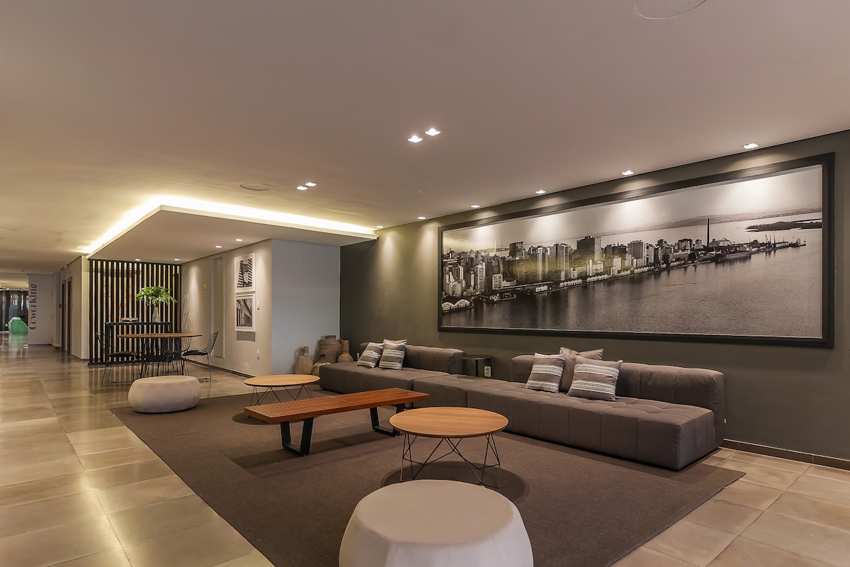 Wonderfull loft, decorated and equipped, comfortably accommodating up to 3 guests. Excellent location in POA downtown, Coliving building with conference meeting room, coworking, kitchen, living space and rooftop with grill (shared spaces). Apartment in a high floor, super cozy and fully equipped: VERY confortable Queen Size bed, sofa bed, bed & bath items, kitchen, AC, SmartTV and WiFi.