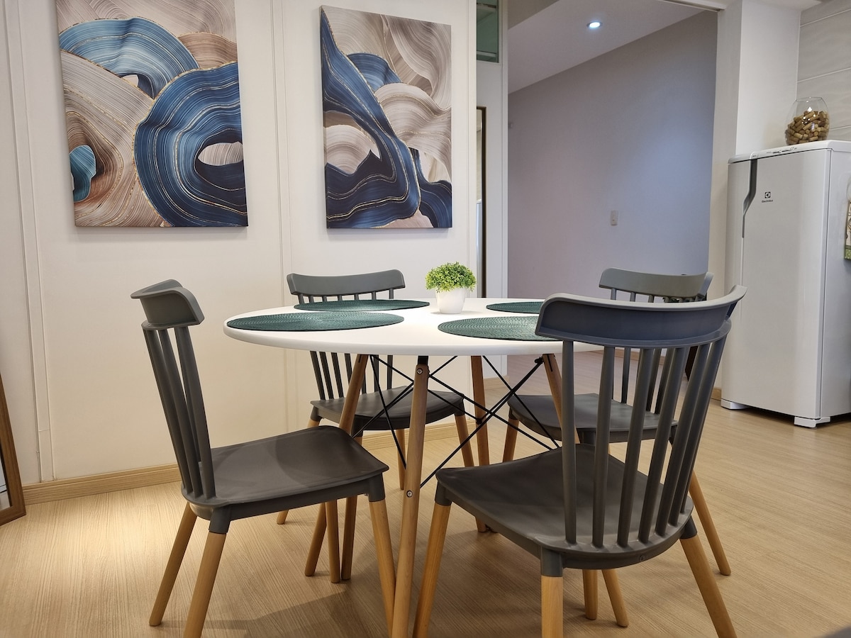 Ideal para estadias curtas ou longas, nosso estúdio oferece um ambiente integrado que combina cozinha, sala e quarto com praticidade e conforto. Conta com uma cama queen e um sofá-cama. O espaço dispõe de ar-condicionado, Smart TV, espelho de corpo inteiro, mesa com duas cadeiras e uma cozinha completa para suas refeições do dia a dia. O banheiro é privativo e conta com ducha confortável e secador de cabelos. 2 estacionamentos ao lado do prédio a menos de 50 mt. Diária entre 35 e 60 reais.