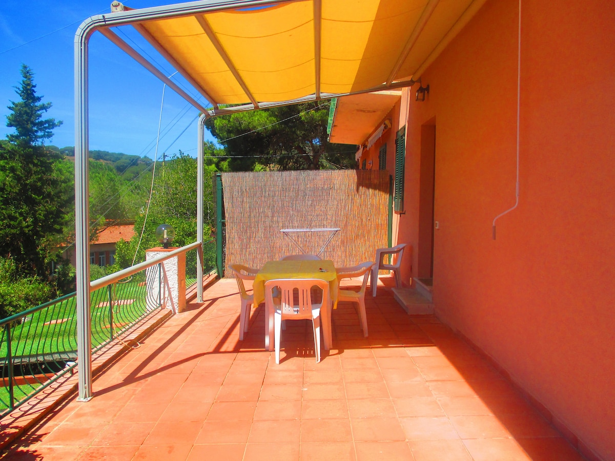 A cosy apartment overlooking the sea and the landscapes of Porto Azzurro bay. There is a large balcony with a sun awning giving shade in the warmest seasons. A peaceful area in the countryside with good local facilities. It's great out of season too for walking or cycling. Its a sunny apartment but very cool inside. In the winter months there is heating. The apartment is on the ground floor but has a few steps to reach the apartment from the car park. There is also free parking facilities.