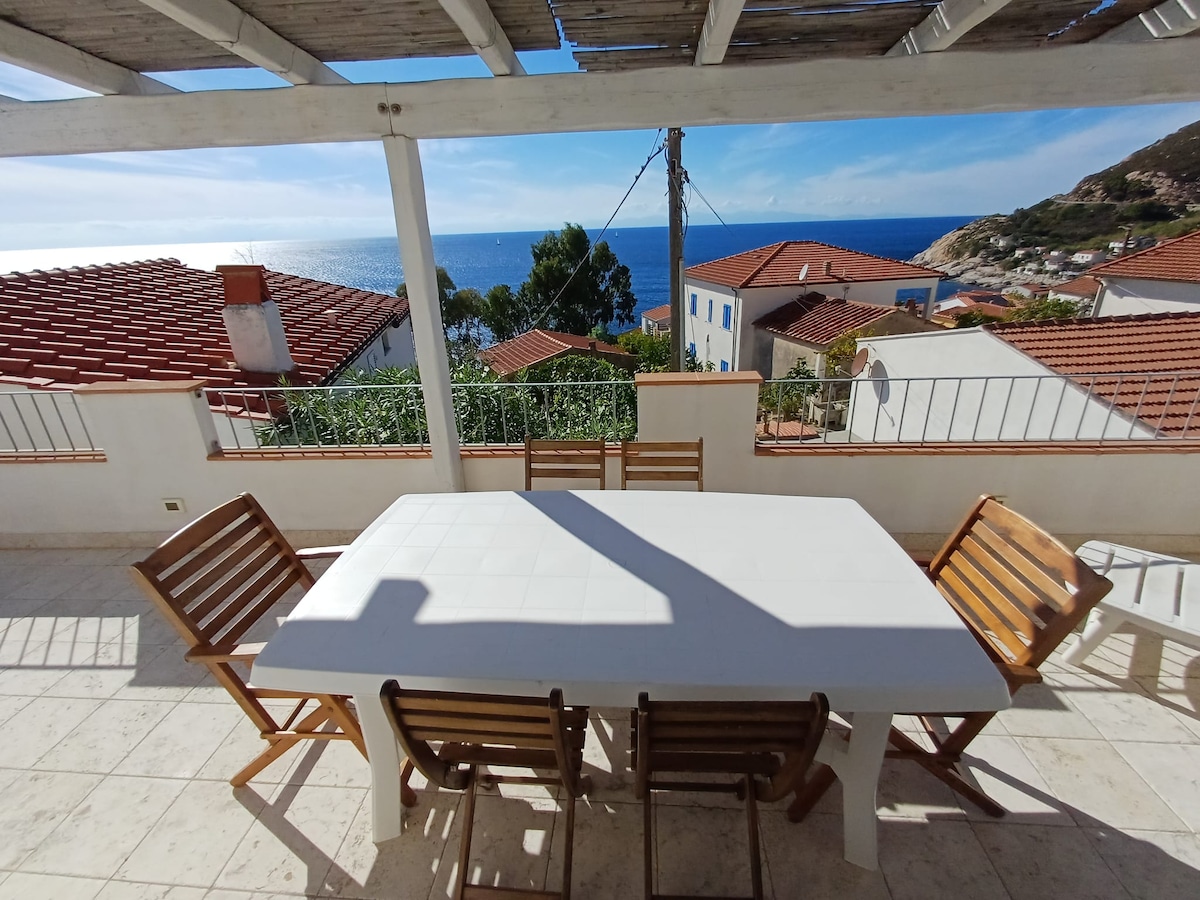 Appartamento, con incantevole vista sul mare, situato al piano terra di una villa, nel cuore della macchia mediterranea del parco naturale di Fetovaia. Composto da ampio soggiorno con zona cottura e divano letto matrimoniale, camera matrimoniale, bagno con doccia. Provvisto di aria condizionata. Confortevole spazio esterno con tavolo e ombrellone, zona relax con lettini e incantevole seduta per colazione e aperitivi. Accesso al mare tramite scale/sentiero (100 metri)