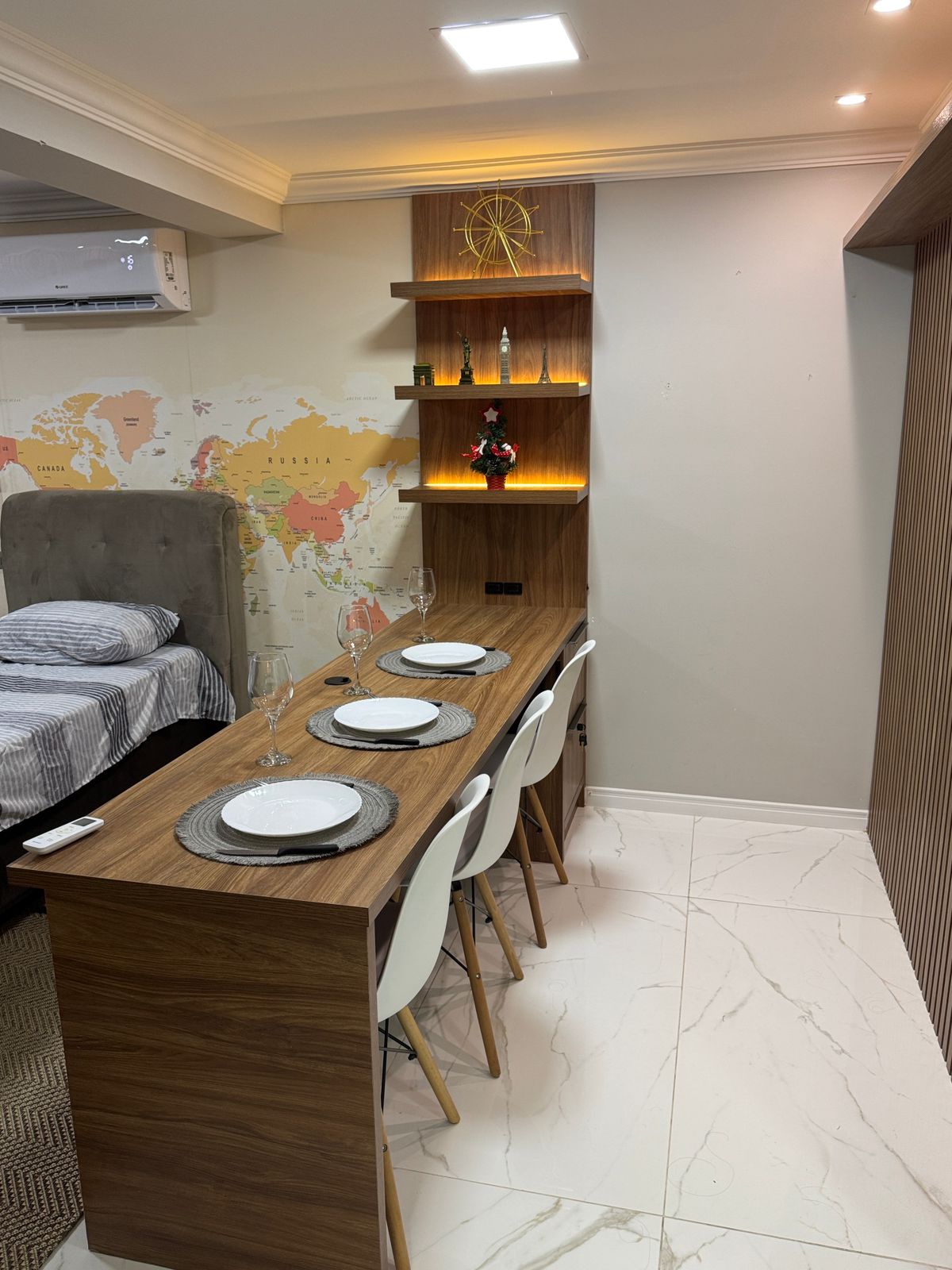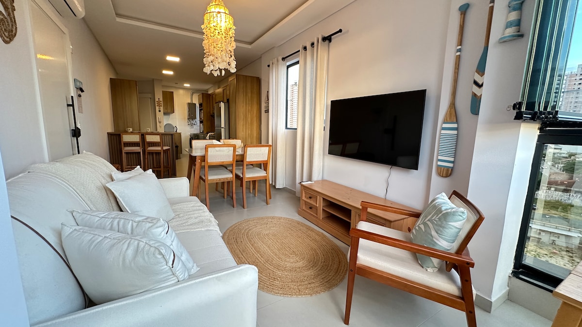 Modern comfort just steps from the sea! Just steps from the beach, this studio was designed for those who value comfort and location. It features a double bed, sofa, Smart TV, air conditioning, an equipped kitchen with integrated dining area, and a charming balcony with city view. The building offers a heated pool and jacuzzi on the rooftop, gym, and game room. Only 220 m from the sea and surrounded by great dining options. Book now and enjoy a complete experience in Meia Praia.