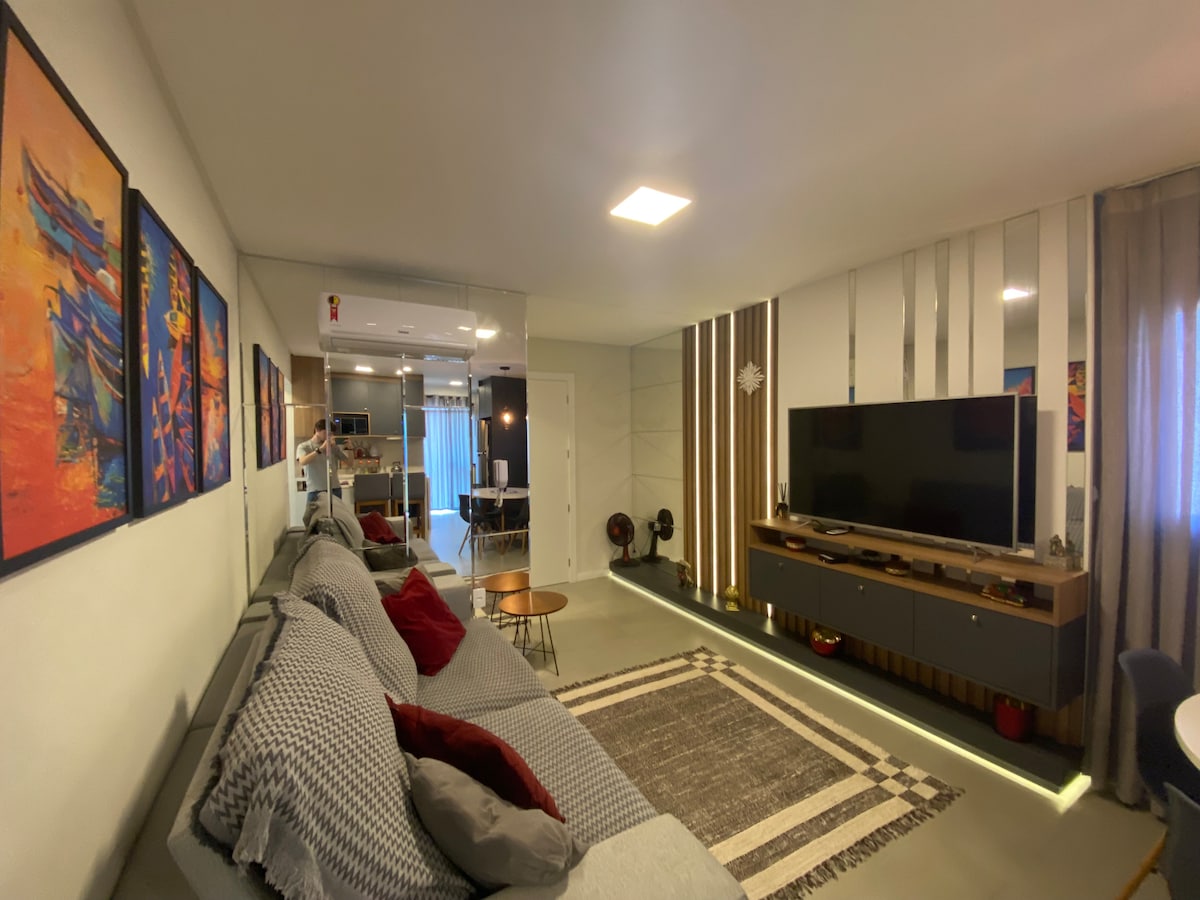 2 bedroom apartment (1 suite / 2 bathrooms in total), decorated in Greek/Mediterranean style, fully furnished with all appliances and bedding. 550m walking distance to the beach. All towels and linings available. 1 hour by car: Beto Carrero, Aeroporto de Florianópolis, Aeroporto de Navegantes, Blumenau. Designed, built and decorated by architect Ana Carolina Lanznaster (ig: ana.lanznaster)