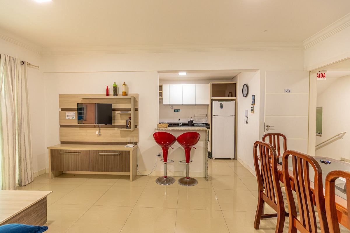 Posição solar: Frente com sacada Localização: Praia de Bombas Muito próximo da praia (poucos minutos a pé) Comodidades: Sala jantar/estar, 1 dormitório com suíte, cozinha funcional. Equipamentos: Wi-Fi, ar-condicionado (verão), churrasqueira, cooktop, refrigerador duplex, filtro de água, máquina de lavar roupas, micro-ondas, forno elétrico Prédio: elevador, vaga para carro descoberta, chuveiro, lava pés Não fornecemos roupas de cama/mesa/banho, acessórios de praia