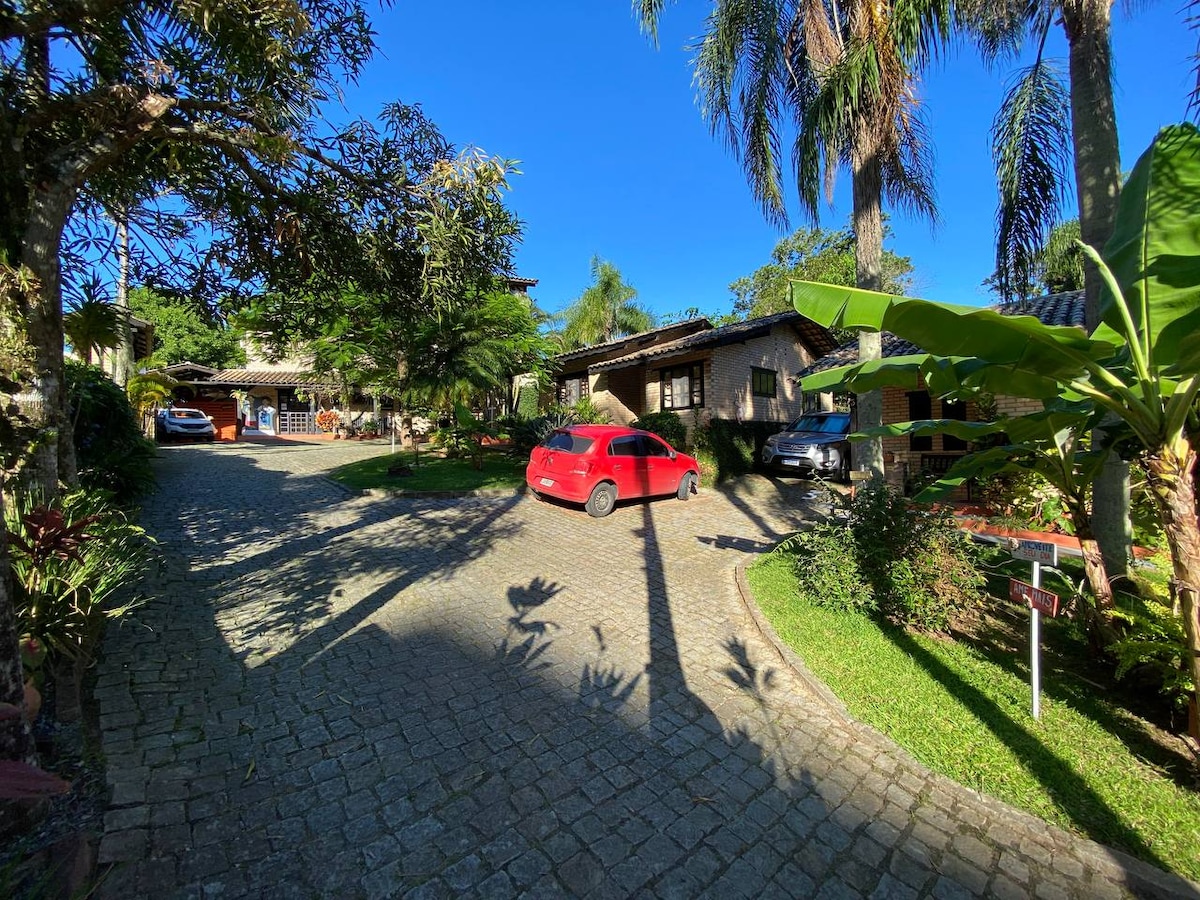 Chalés para casal em residencial tranquilo, perfeito para quem busca descanso, privacidade e contato com a natureza, com jardim exuberante e clima acolhedor, lugar pra desacelerar de verdade. ✔️ Estacionamento ✔️ Cozinha equipada ✔️ Dormitórios com TV e ar. ✔️ Cesta de café ✔️ Massagem e terapias a parte Na área compartilhada piscina, churrasqueira e sala de estar para curtir bons momentos a dois. Ideal para quem quer estar perto da praia e, ao mesmo tempo, em um ambiente calmo e familiar.