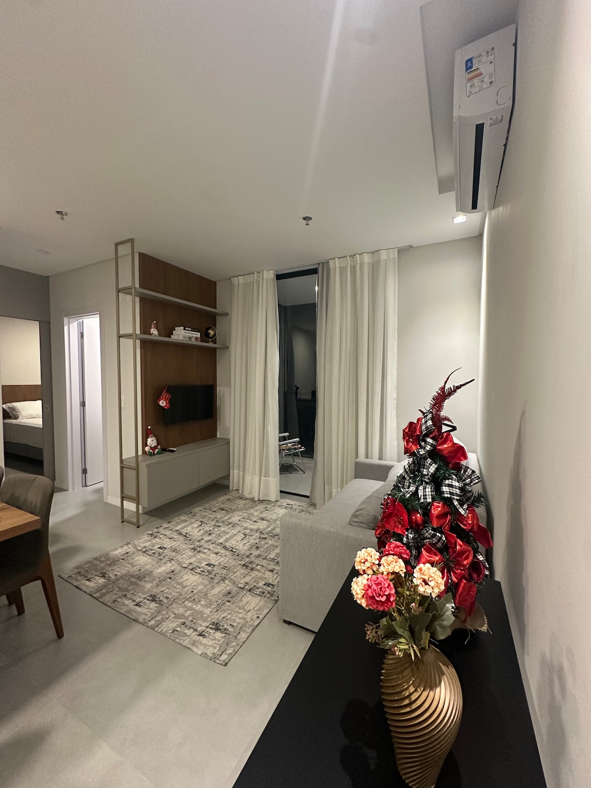 Modern and cozy apartment located in Residencial Sunny Flats, approximately 400 meters from Bombas beach in Bombinhas. It has a beautiful outdoor area with a swimming pool on the terrace, gourmet area, fire pit, games room, and kids' area. It has an integrated living room and kitchen with a dining table, a guest bathroom, 1 air-conditioned bedroom, a sofa bed in the living room, and a balcony with a private barbecue.