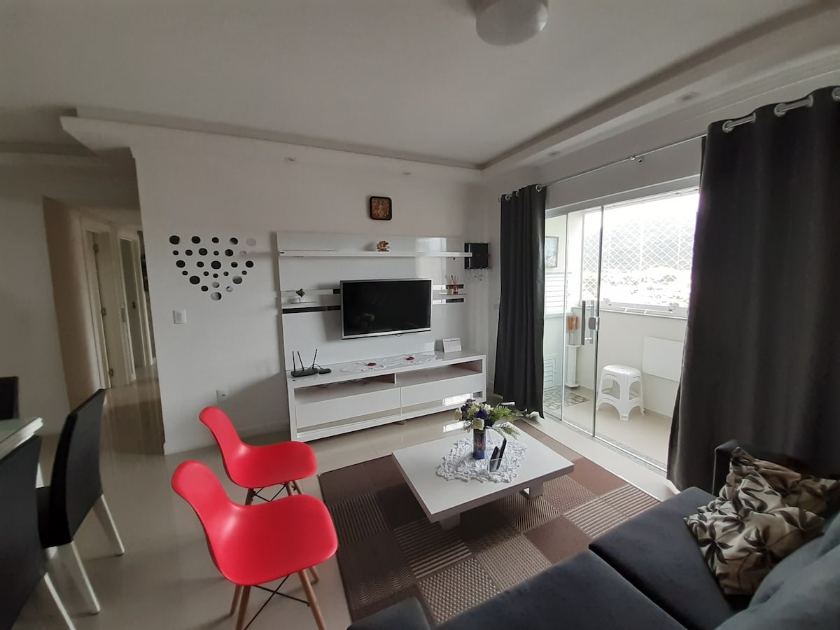 Apto amplo, ideal para 06 adultos e 2 crianças, com 3 quartos (uma suíte), um colchão extra e um puff multiuso recomendados para criança, 2 banheiros, mobília completa. Ampla sala com TV, Wi-Fi, cervejeira, churrasqueira e rede de proteção. AR-CONDICIONADO EM TODOS OS AMBIENTES, inclusive na sala. Localizado a 100 metros da excelente praia de Perequê no município de Porto Belo/SC. Possui uma vaga exclusiva de garagem e box de praia com cadeiras, guarda-sol e carrinho para locomoção.
