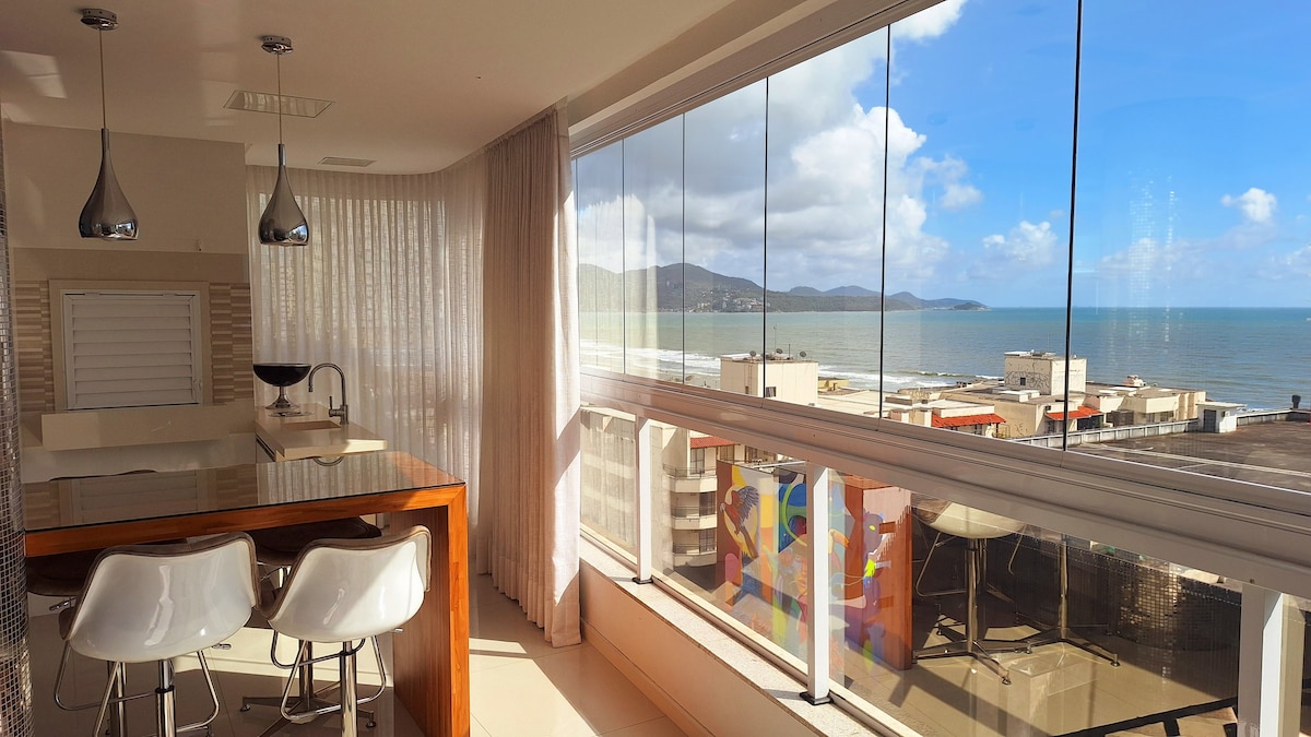 FRENTE MAR. São 4 quartos (Suite Casal, quarto Casal, quarto Casal com Beliche e Suite Solteiro). Tem uma varanda espetacular, ela tem poltronas e churrasqueira onde poderá ver o mar de uma vista de toda a praia de Itapema e Meia-Praia. O apto é perto de supermercados, Havan, restaurantes, bares, transporte público e do centro da cidade. Você vai amar nosso espaço porque fica na área mais tranquila da praia. Nosso apto é excelente para casais e famílias (com crianças).