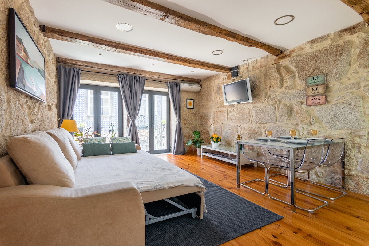 Fabulous premium 1 bedroom apartment with balcony located in the trendiest neighbourhood of Porto's historical city center, between Ribeira and São Bento. NEIGHBORHOOD * Largo São Domingos * Ribeira * São Bento Train Station * Many trendy Restaurants & Bars * Historical and cultural area APARTMENT * 2º floor - no elevator * Balcony * Wi-Fi * Cable TV * Dining table w/ 4 chairs * Bathroom with bath and hand towels * 1 queen-size bed 160x200