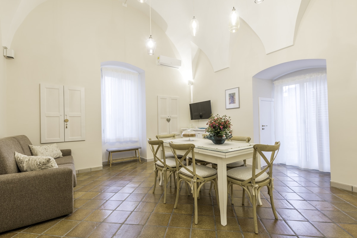 L’appartamento, su due livelli, si trova al secondo piano (62 GRADINI SENZA ASCENSORE) di un palazzo nobiliare del XVI secolo, sito tra le due strade principali del centro storico e gode, dalle finestre del salotto, di una meravigliosa vista di piazza Duomo. È composto da ingresso, salotto, due camere da letto, sala da pranzo, cucina, due bagni e da un terrazzo attrezzato (70 mt) al livello della cucina, da cui si gode della vista del campanile e del quartiere antico.