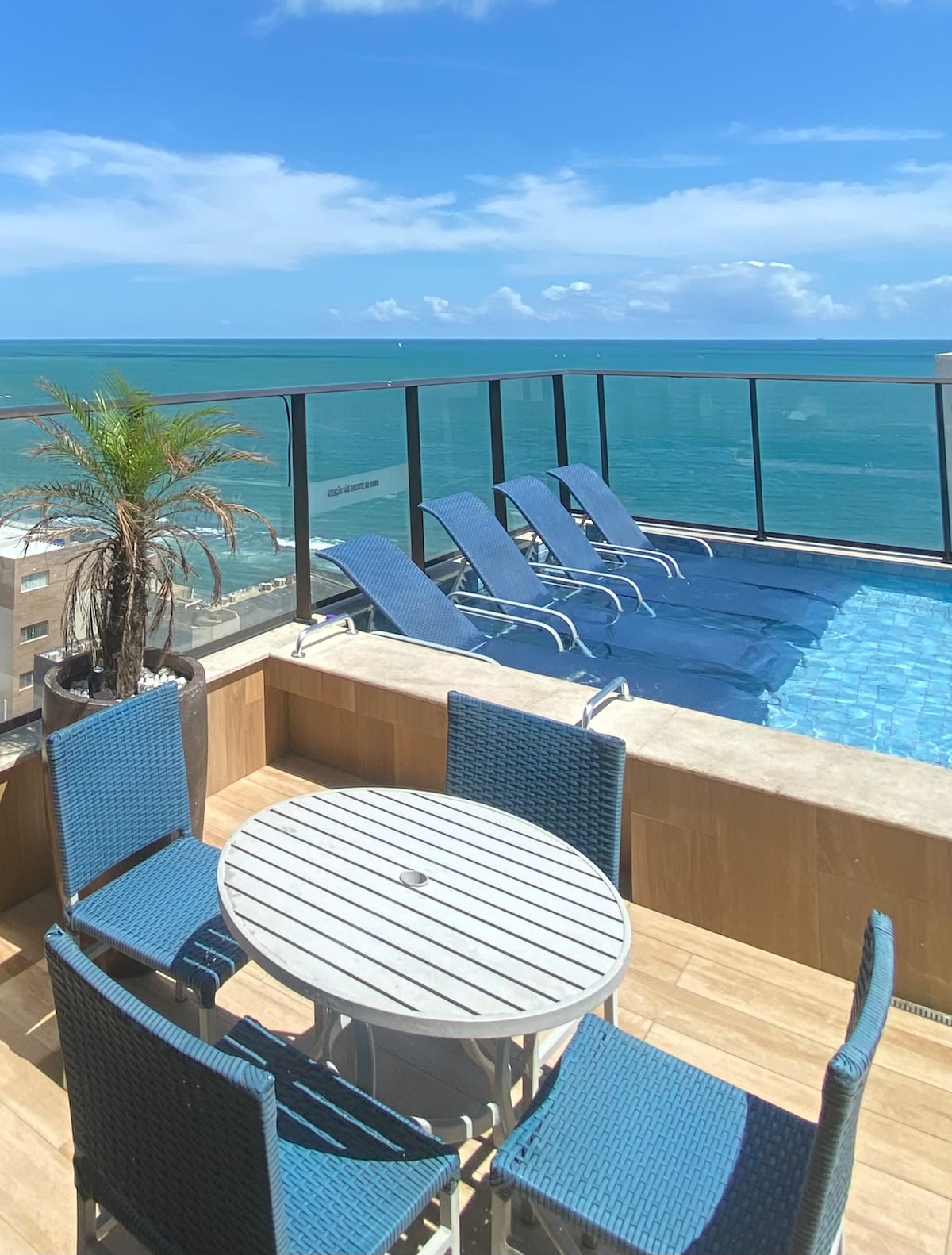 Apt na Barra (bairro turistico) de Salvador, vista mar panorâmica, paralelo ao circuito do Carnaval. 2 min de caminhada ao Farol da Barra. O quarto e sala acomoda até 04 pessoas (quarto cama queen e sala com sofá-cama). Ar condicionado e smart TV em todos os cômodos. Cozinha completa com fogão, forno, microondas, geladeira, filtro de água, cafeteira Nespresso e todos os utensílios Automatizado por Alexa 1 vaga de garagem, rooftop com piscina e academia Lavanderia no térreo PROIBIDO FUMAR