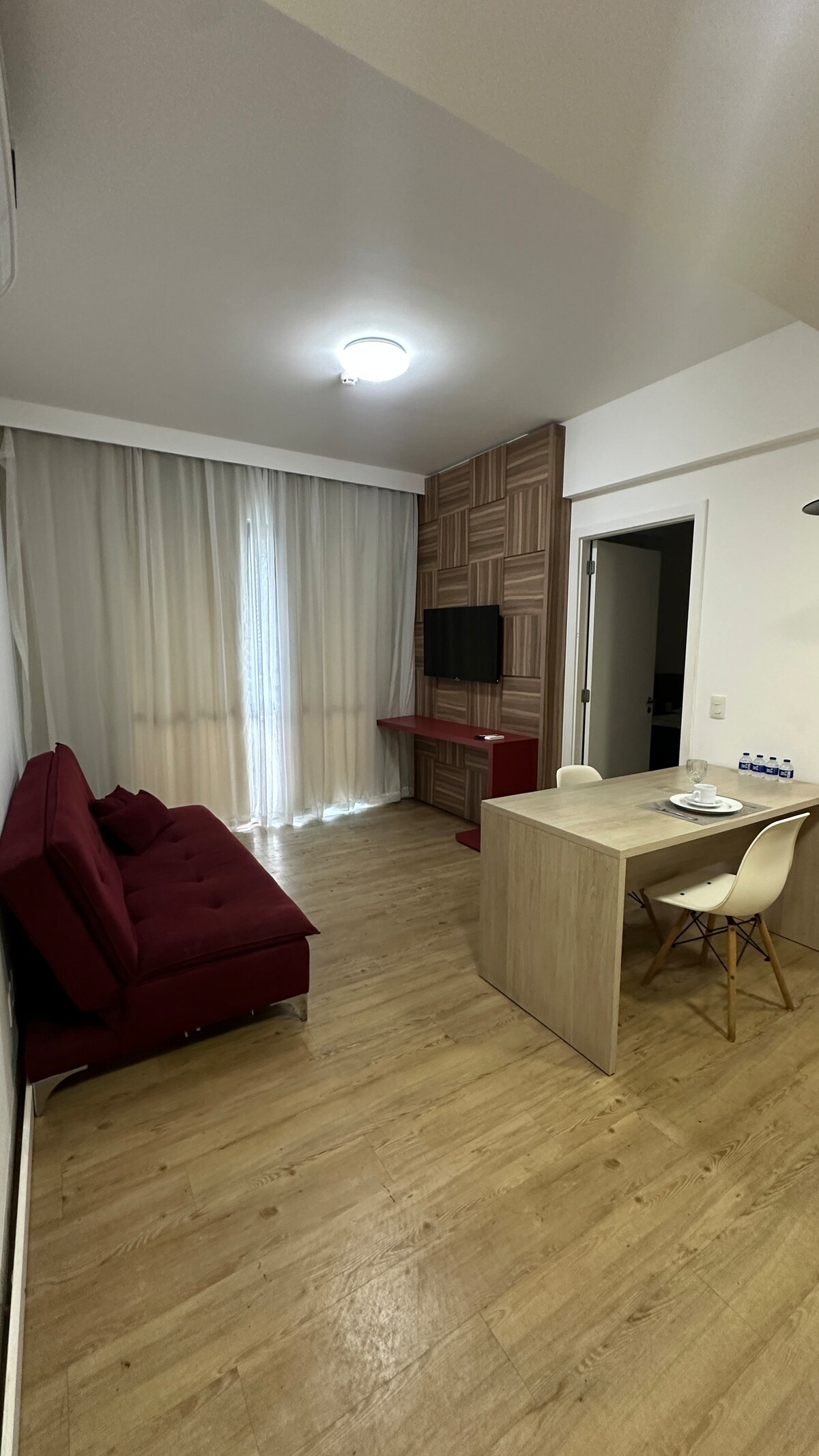 Flat mobiliado frente-mar, confortável e funcional, ideal para temporada. Ambiente completo com ar-condicionado, TV, mesa de trabalho e sofá-cama. Cozinha equipada com frigobar, micro-ondas, forno de indução, cafeteira, sanduicheira e utensílios. Possui duas cortinas (elétrica e manual com bloqueio solar), garantindo conforto, privacidade e bem-estar. Perfeito para relaxar ou trabalhar com vista para o mar.