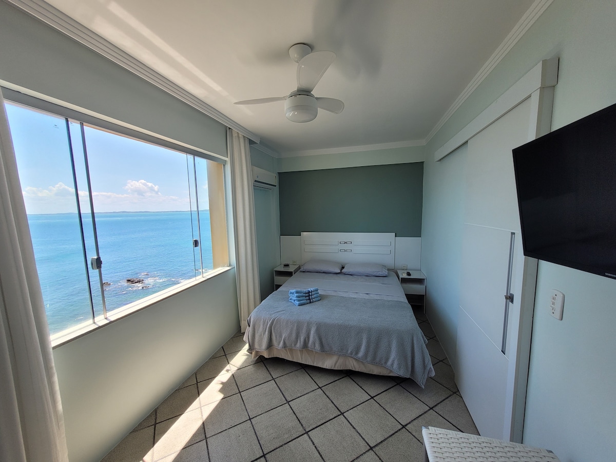Flat novinho, recém reformado, em frente a praia, com vista lateral para o mar: da varanda é possível apreciar a praia, a avenida e o pôr do sol da Barra. Localizado no melhor ponto da Barra, perto de restaurantes, bares, mercados, farmácias e do Shopping Barra, além de fácil acesso aos principais pontos turísticos de Salvador. Dispõe de ar-condicionado split, ventilador de teto, TV e uma cozinha equipada (sem fogão). O Flat dispõe de camareira para limpeza diária e piscina de uso comum.