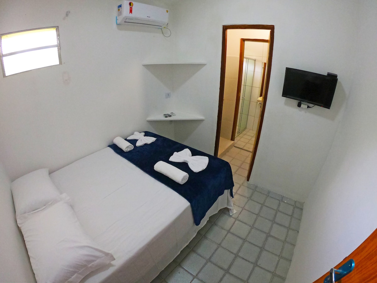 Suites com cama, ar-condicionado, frigobar, banheiro privativo com ducha quente, Wi-Fi e TV.