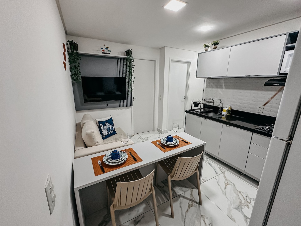 Aptº térreo com área Garden privativa. Internet 500 mega de alta velocidade. Cozinha com todos itens ( fogão, microondas, geladeira, liquidificador, batedeira, espremedor de laranja e sanduicheira). Banheiro com chuveiro quente frio e reversível. Sala com Smart tv 32 pl e sofá cama. Quarto com cama de casal + auxiliar, Smart tv de 32 pl e ar condicionado. Aptoº com cortinas e blecautes para maior privacidade. Estacionamento, água mineral e itens de cama e banho inclusos.