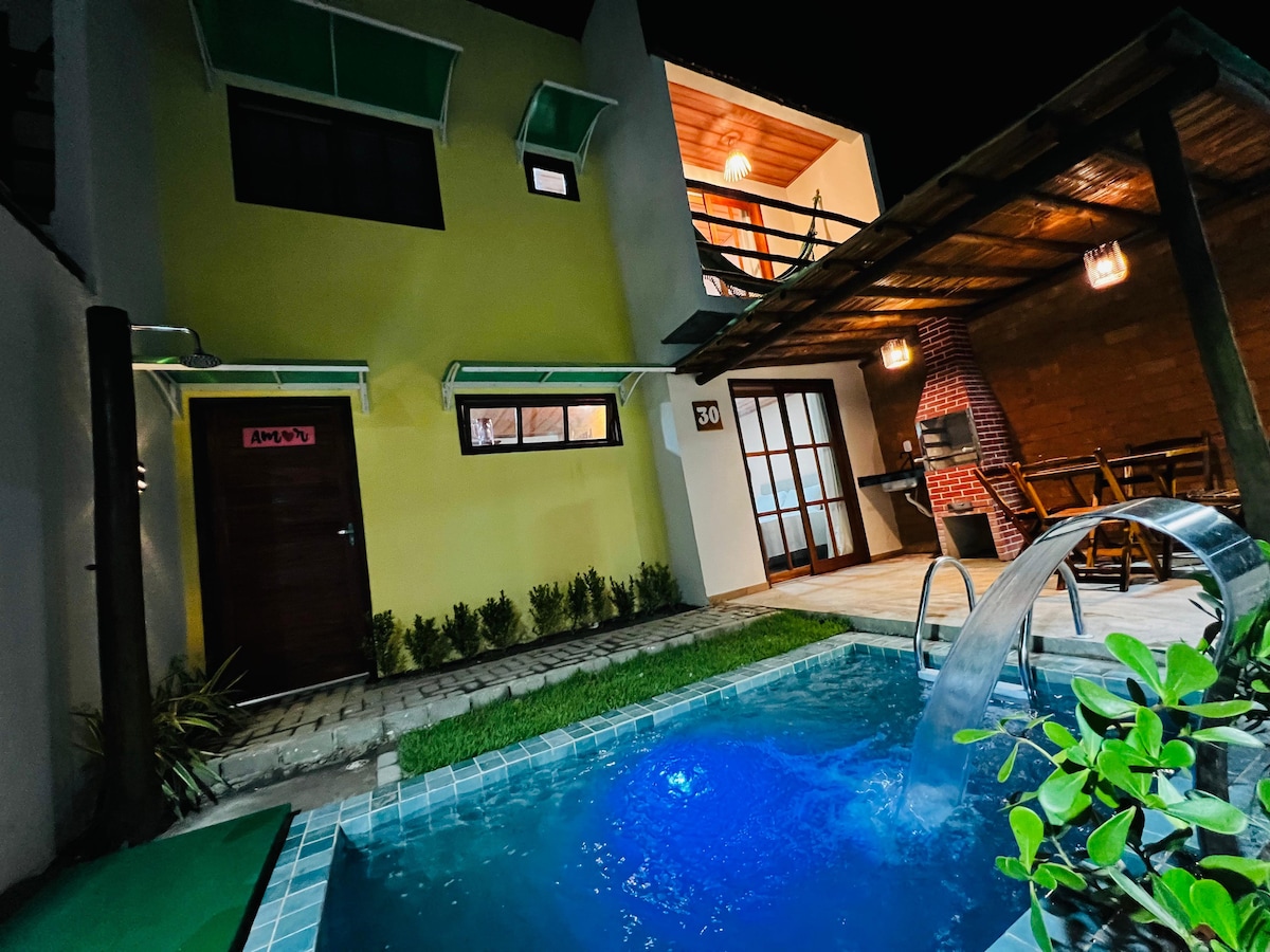 Relaxe neste espaço cheio de estilo a 900 mts da beira mar do Patacho por uma trilha, com piscina privativa no rooftop, churrasqueira, mesa, cadeira, o andar térreo conta com uma varanda, o quarto com 1 cama queen, 1 bi cama, ar split 12 mil, smart tv, uma cozinha com cooktop de 2 bocas, frigobar de 100L, armários, panelas, talheres, utensílios, copos, liquidificador, sanduicheira, cafeteira, banheiro com chuveiro elétrico, quintal e 1 vaga de garagem, cadeiras de praia, guarda-sol e cooler.
