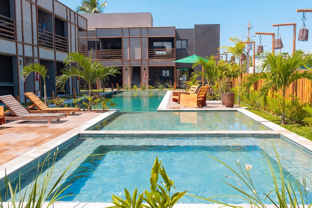 A poucos passos do condomínio, você encontra uma praia paradisíaca e quase exclusiva, com águas cristalinas e piscinas naturais na maré baixa. O imóvel é um apartamento duplex em condomínio à beira-mar, com piscina, academia e solarium. Conta ainda com piscina privativa aquecida com hidromassagem no rooftop, além de chuveiros e colchões de alto padrão. Próximo ao condomínio, há restaurante e bar de praia à beira-mar, perfeito para desfrutar de refeições deliciosas e drinks refrescantes .