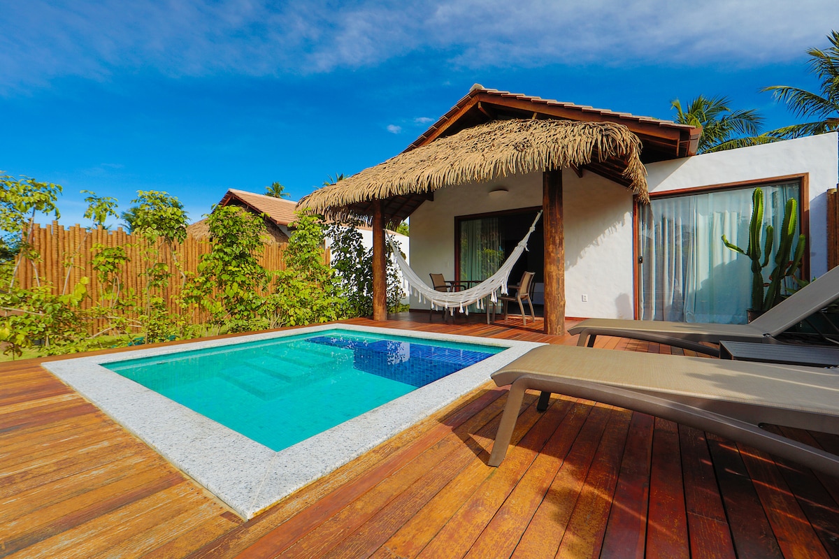 Os bangalôs dispõem de piscina privativa e medem 68m². Acomodações incluem cama king size, banheira de imersão, e TV Smart de 43" com TV a cabo. A varanda oferece uma rede para relaxar. O ambiente é climatizado com ar-condicionado split e conta com frigobar, bwc, lavabo, e ducha. Segurança é garantida com cofre. Toalhas Trousseau e amenities L'Occitane estão disponíveis.