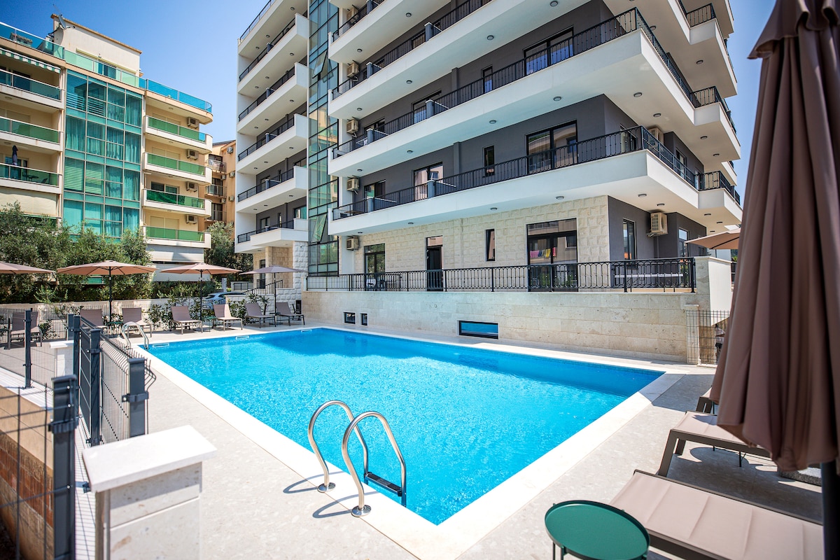 现代1卧室,带泳池、停车位和早餐