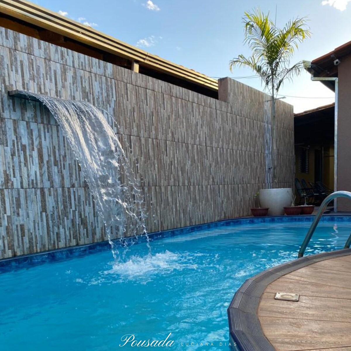 Esse valor e reserva permite a hospedagem de 12 pessoas. salão para eventos – 200 pessoas, sala de reunião com 30 lugares. Espaço para lazer com piscina, quadra de esportes. Cozinha completa com churrasqueira, air fryer, micro-ondas, sanduicheira, liquidificador, fogão a gás e lenha e máquina de lavar. Acesso a natureza com mini cascata com peixes, jardim, pomar, família de micos e várias espécies de pássaros. Parcerias com agências de viagens: turismo religioso, rota das araras, jalapão