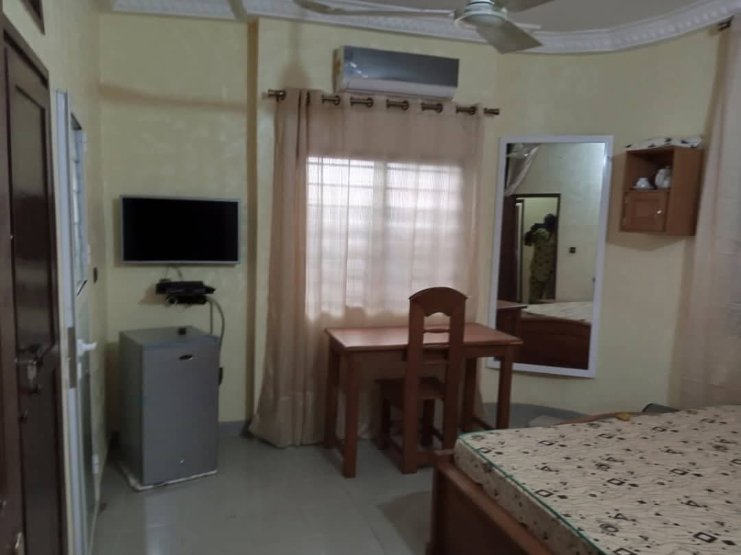 Appartement climatisé, équipé d'une armoire de rangement, d'un téléviseur et d'un décodeur CANAL+ , d'une table de travail .Une grande terrasse pour prendre de l'air et peut servir de salle de fête d'une capacité de 50 convives.