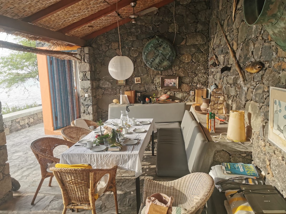 Une grande pièce servant de chambre et de séjour, ouvre sur une immense terrasse donnant sur la mer, face au Brésil, véritable lieu de vie avec sa cuisine ! Derrière, à l'ombre d'un acacia australien, une cour pavée de galets où l'on peut trouver la fraicheur.